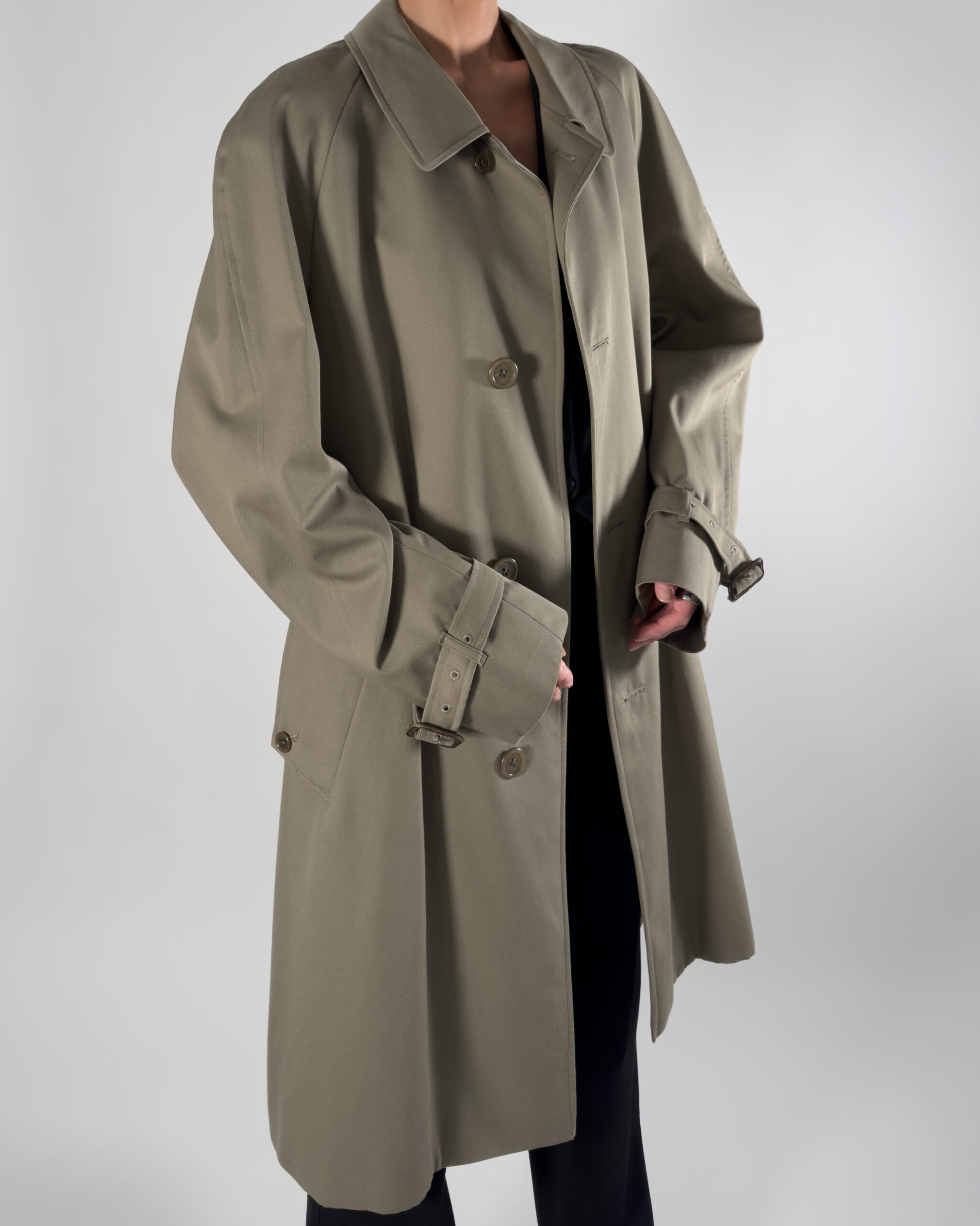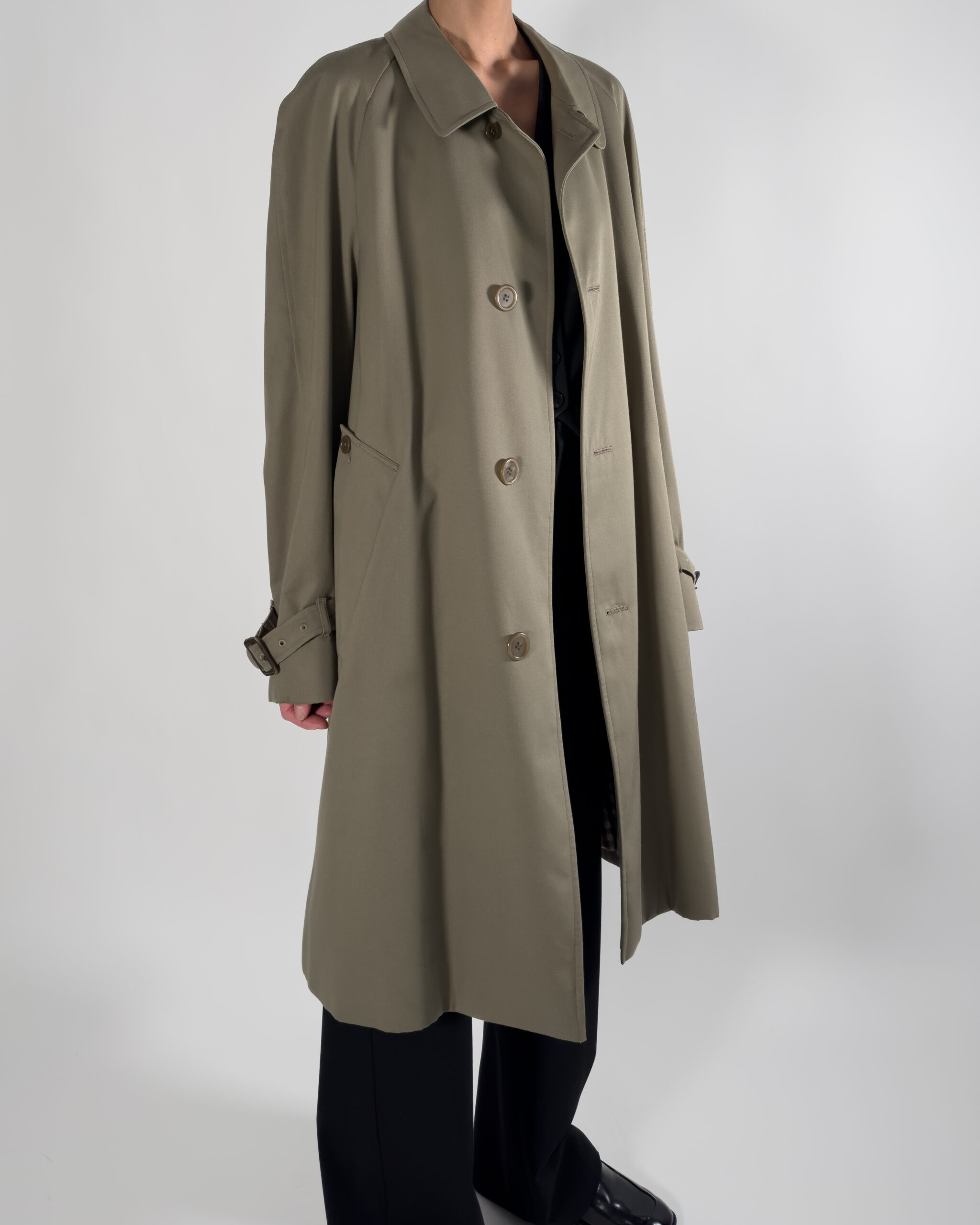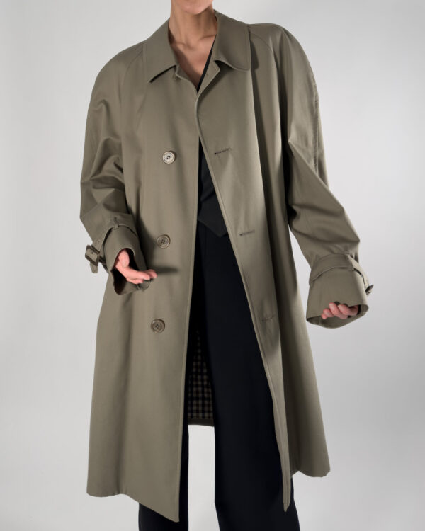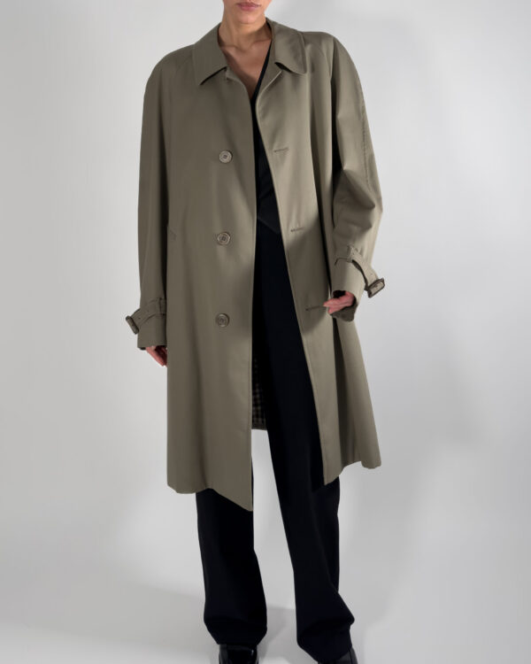 By Aquascutum of London, this trench coat features a button-up closure and a classic back slit. Made in England.