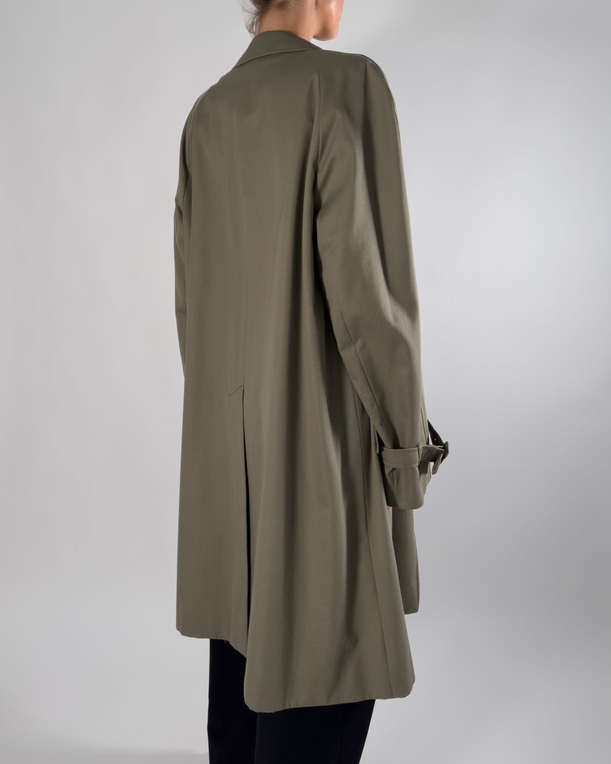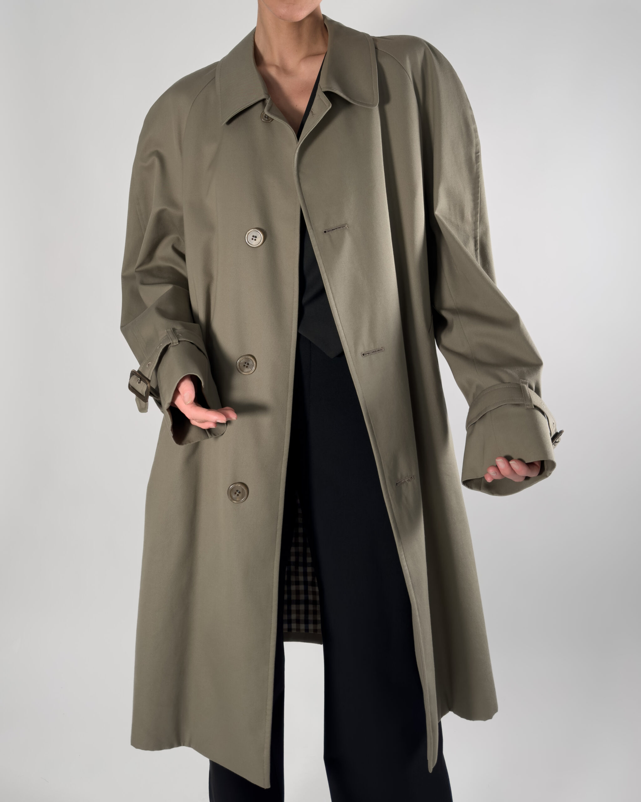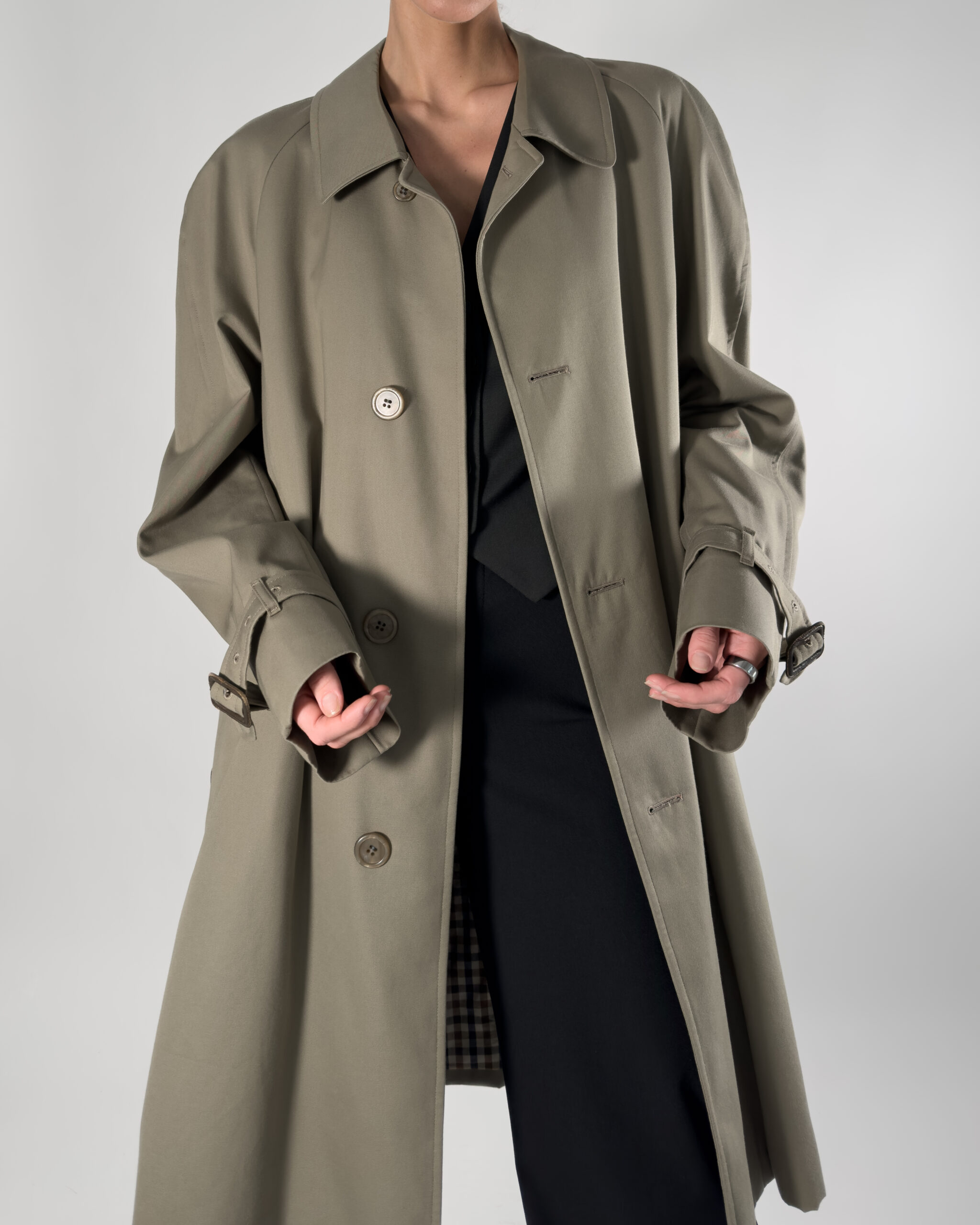 By Aquascutum of London, this trench coat features a button-up closure and a classic back slit. Made in England.