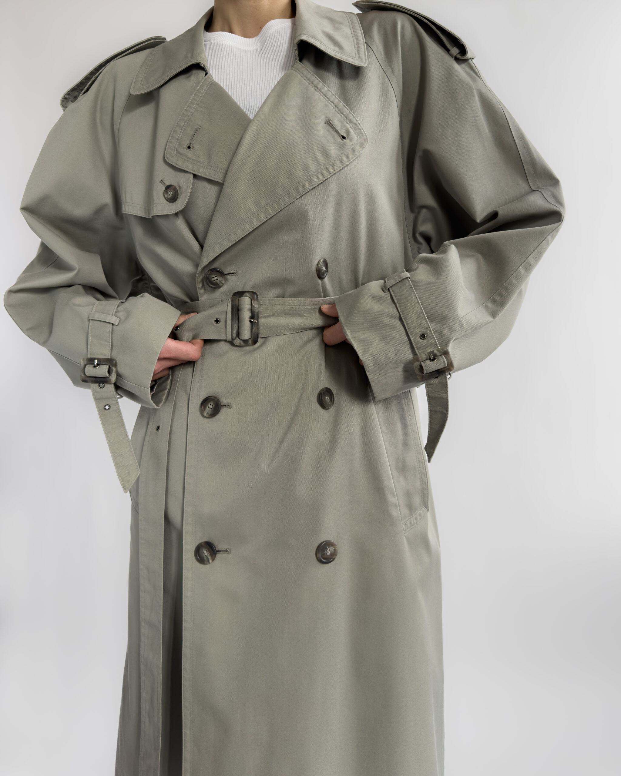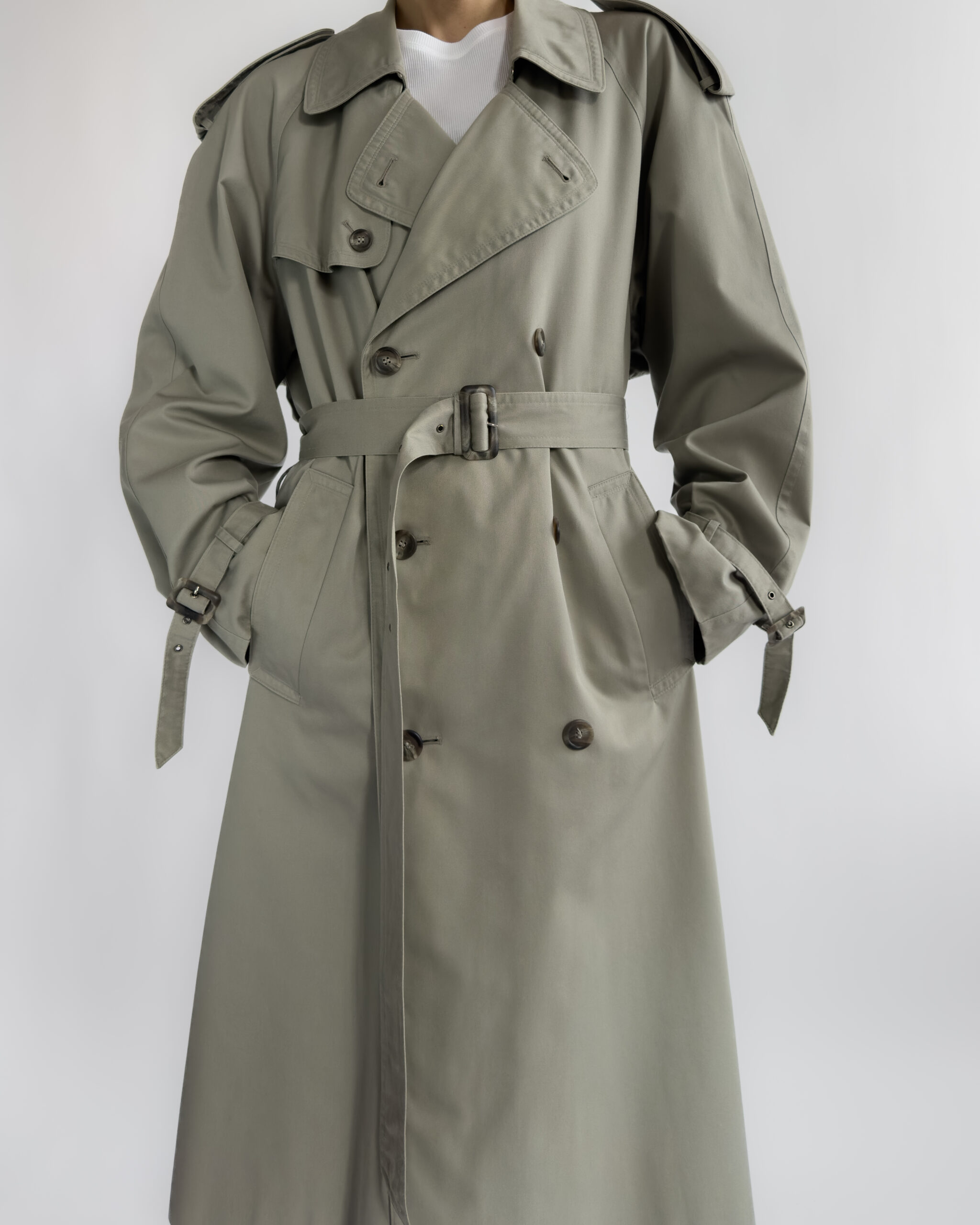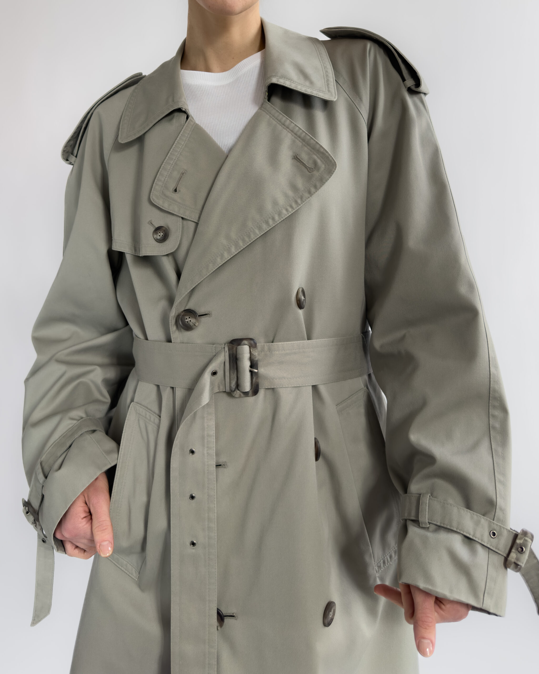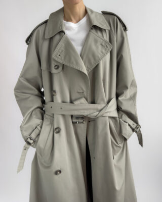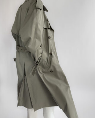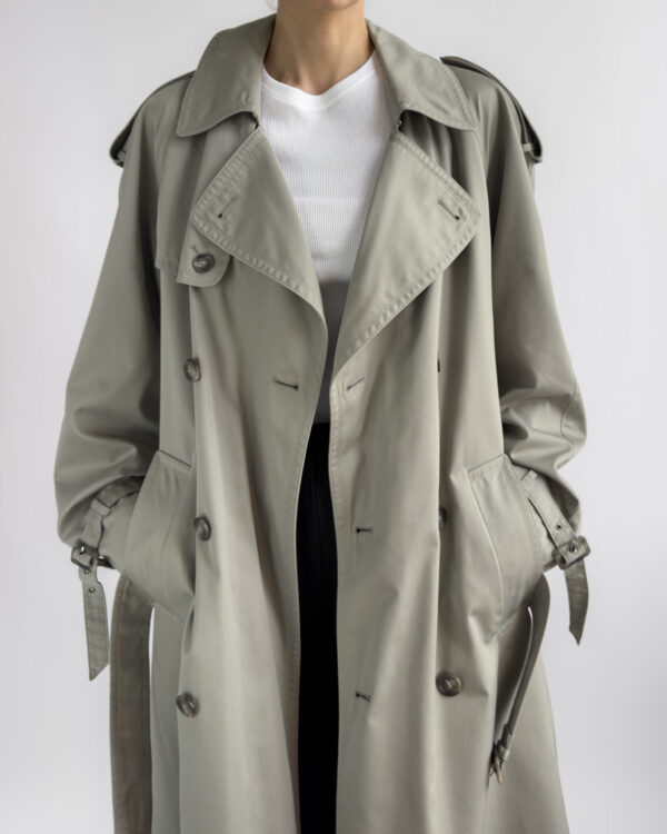 Made from a structured cotton-blend, this vintage trench coat features a timeless double-breasted cut with classic storm flaps, epaulettes, and a belted waist. The light sage-grey tone is enhanced by marbled buttons and adjustable cuff details.