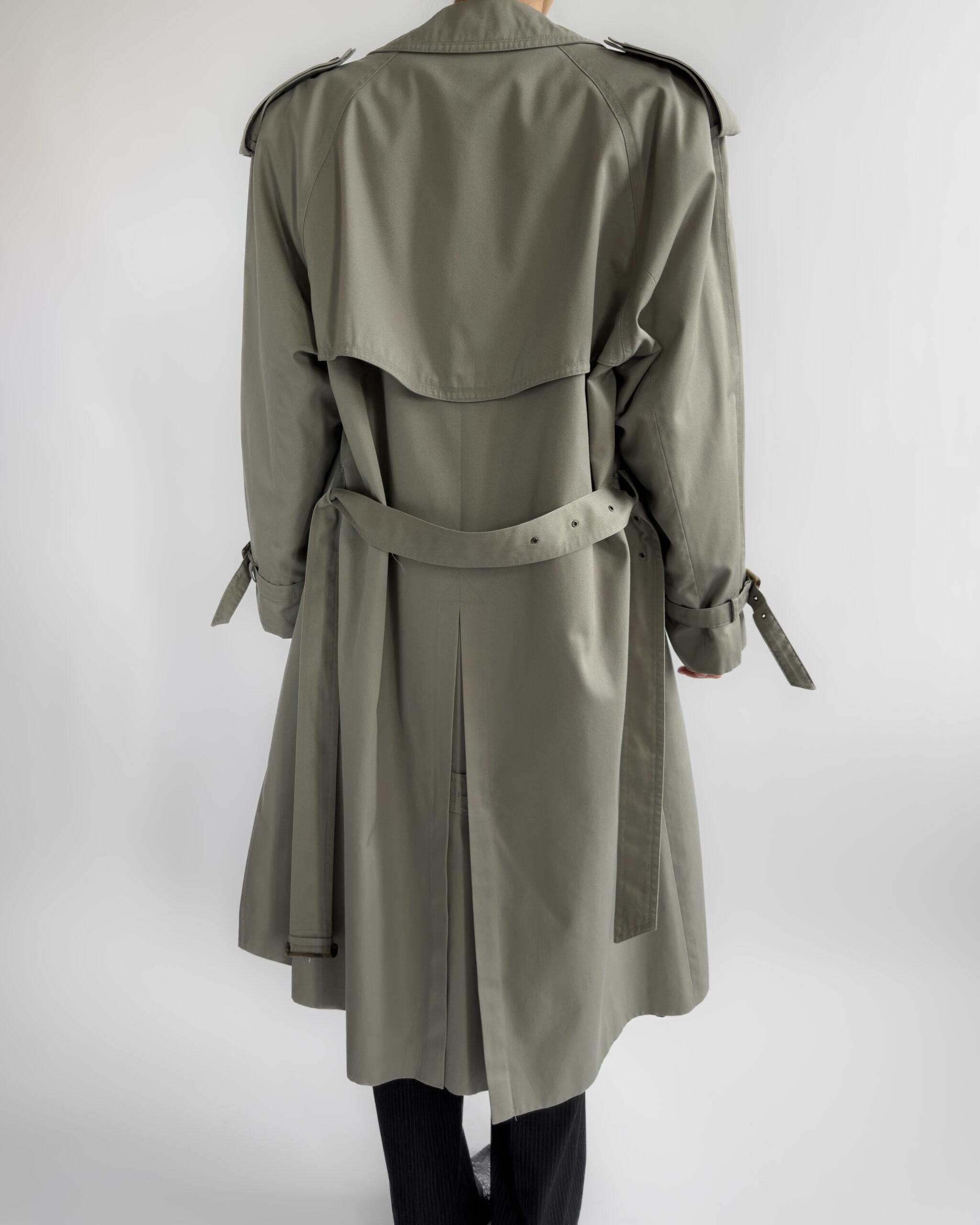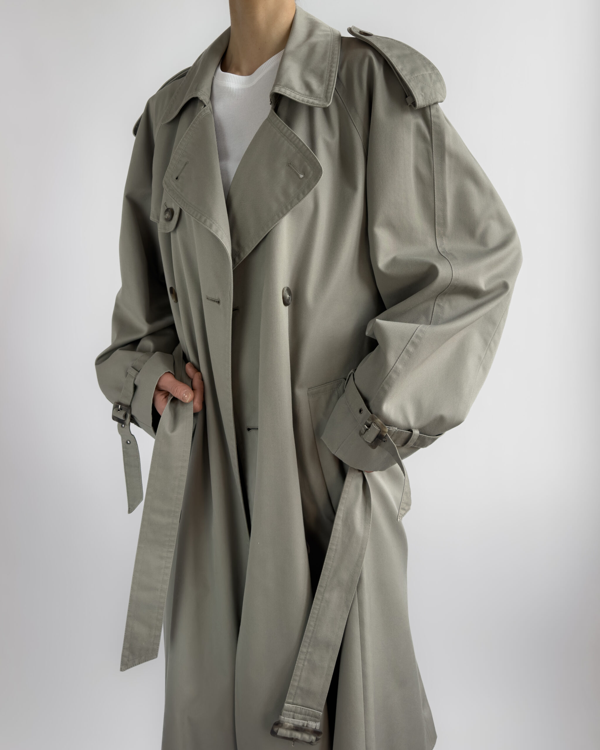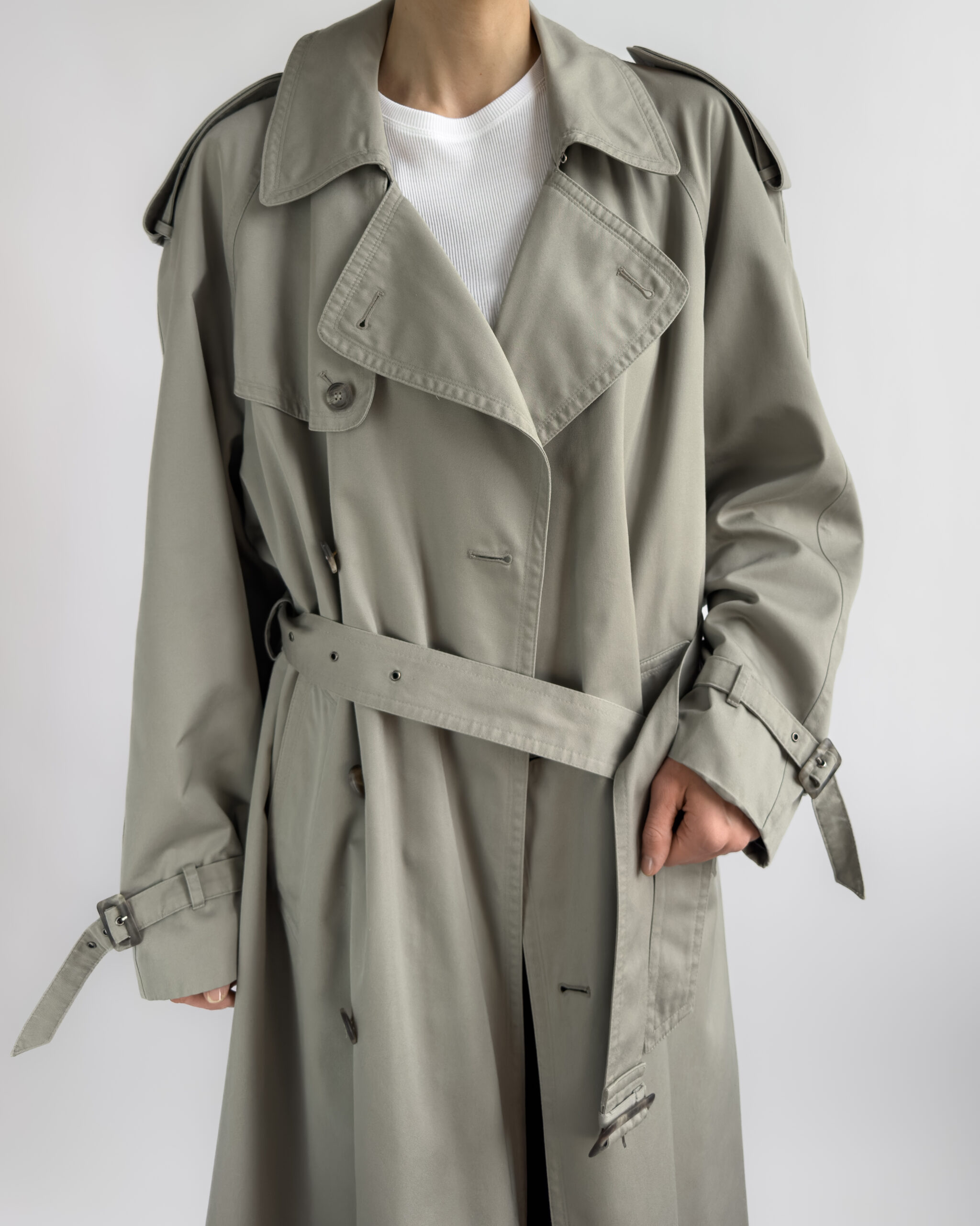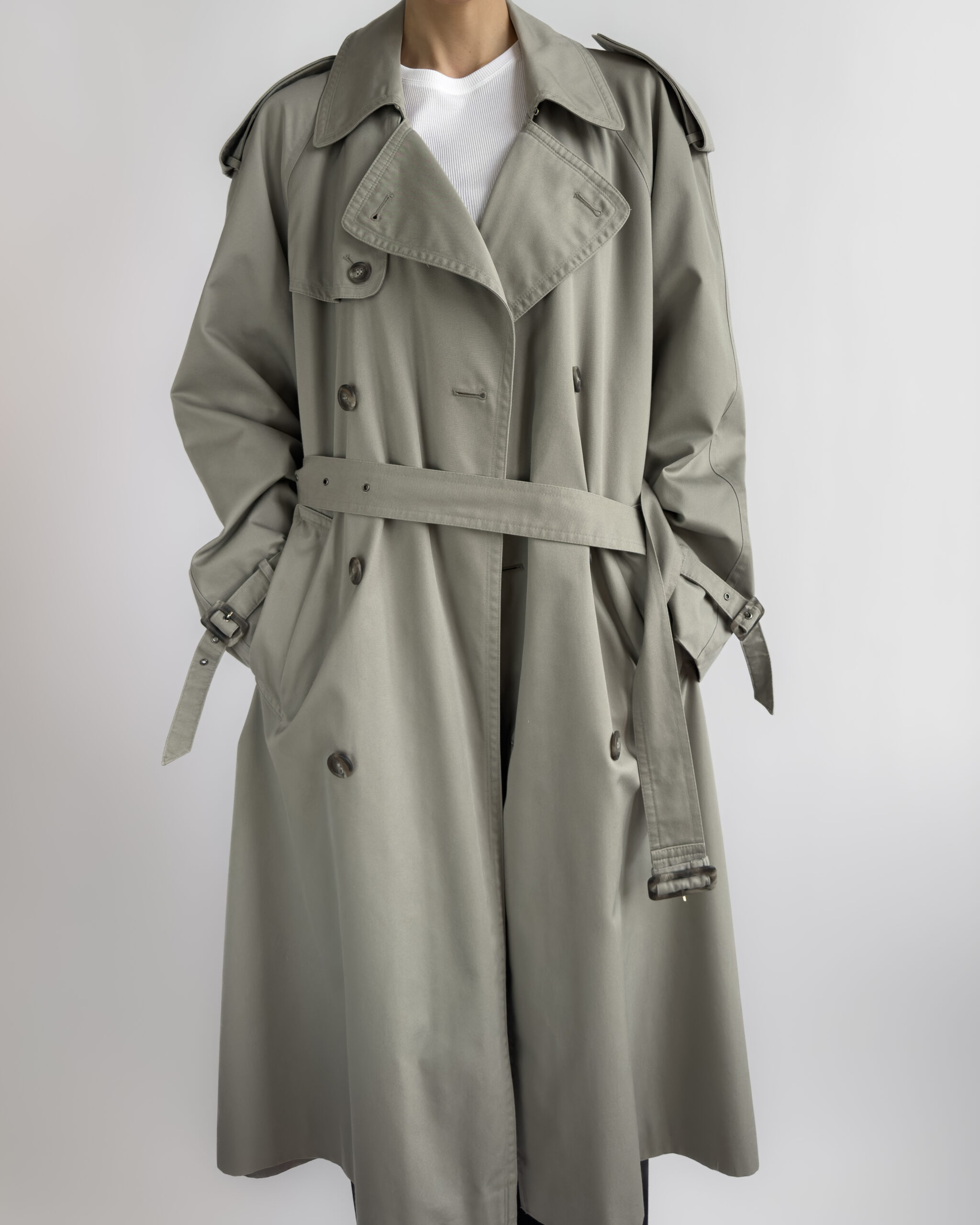 Made from a structured cotton-blend, this vintage trench coat features a timeless double-breasted cut with classic storm flaps, epaulettes, and a belted waist. The light sage-grey tone is enhanced by marbled buttons and adjustable cuff details.