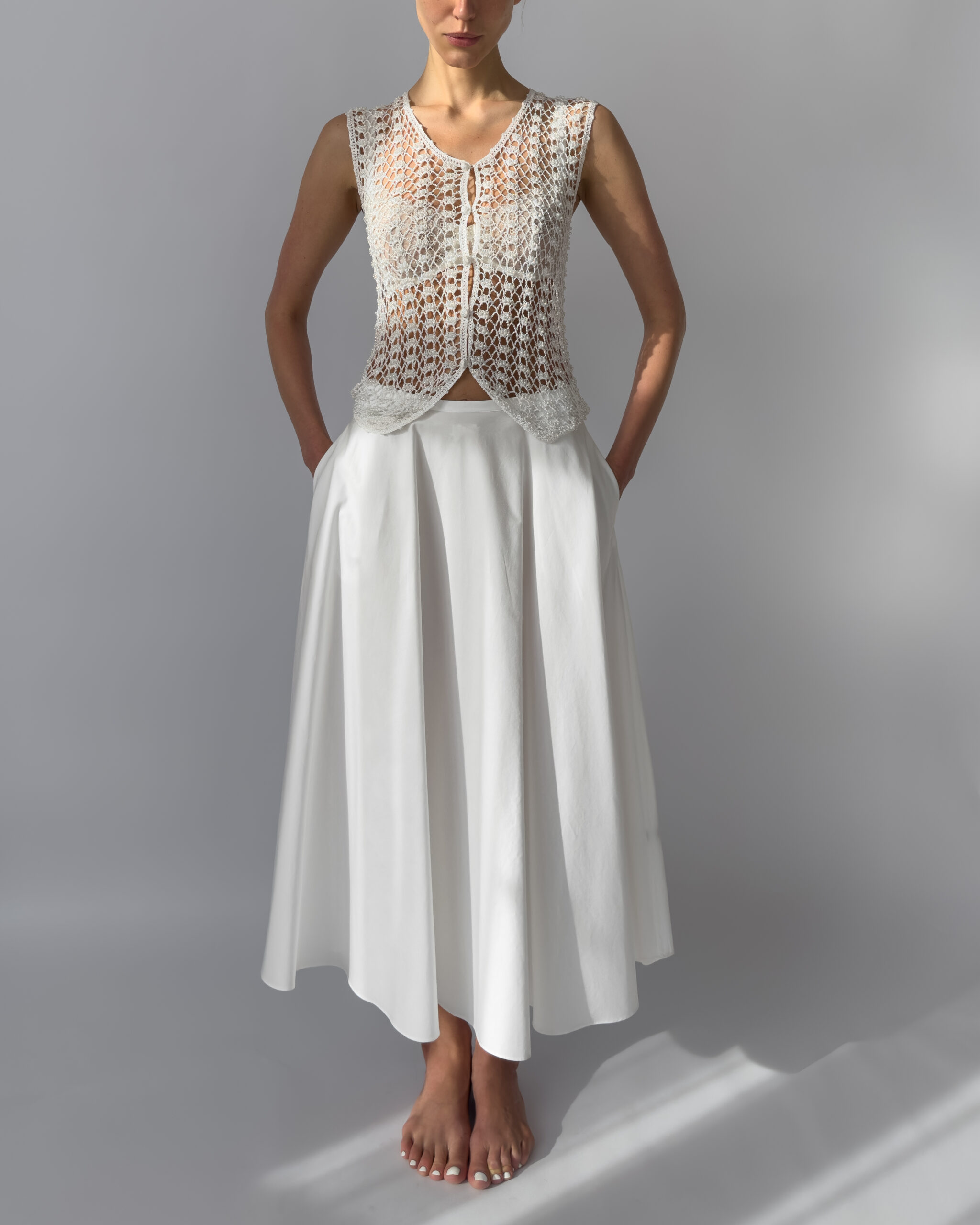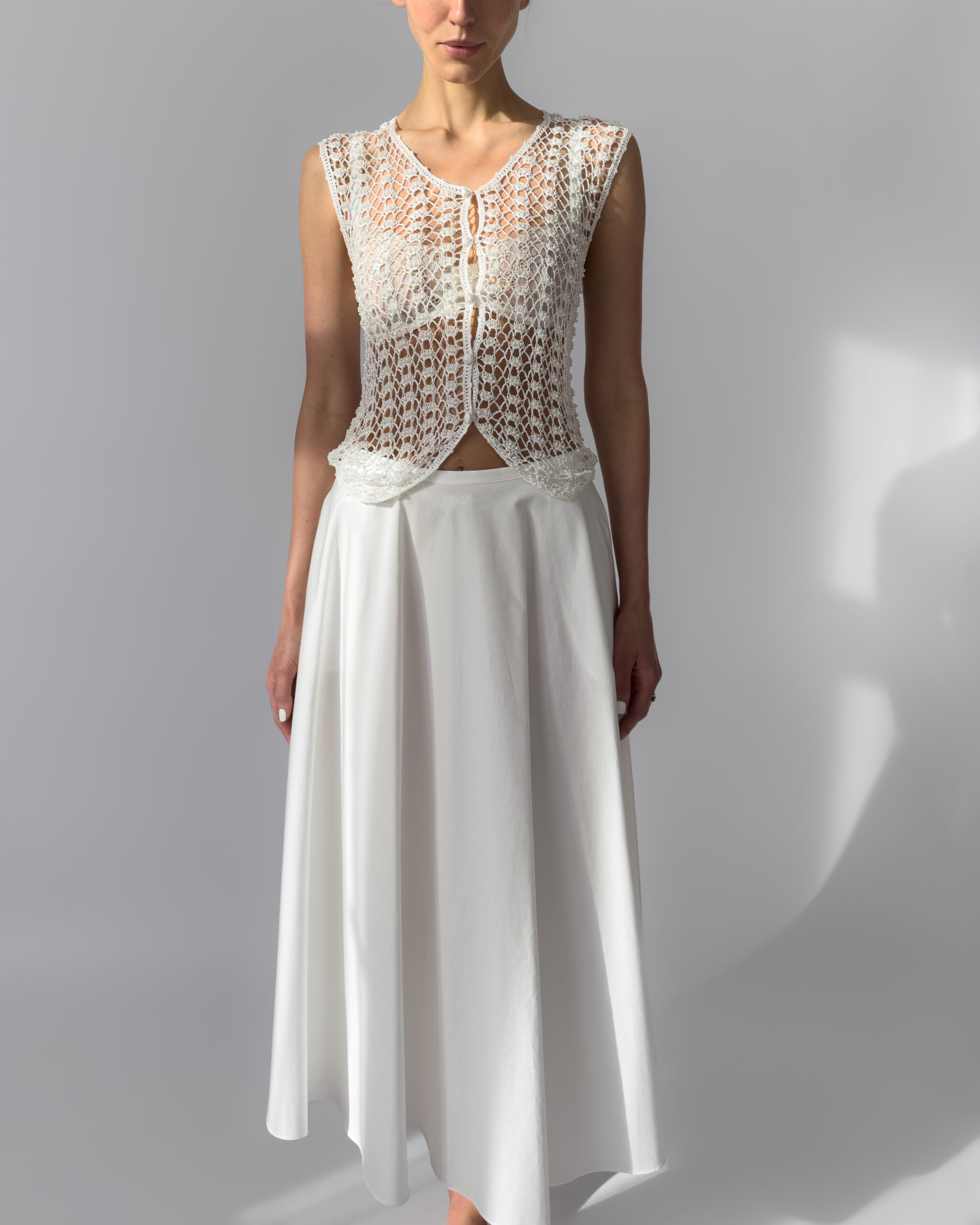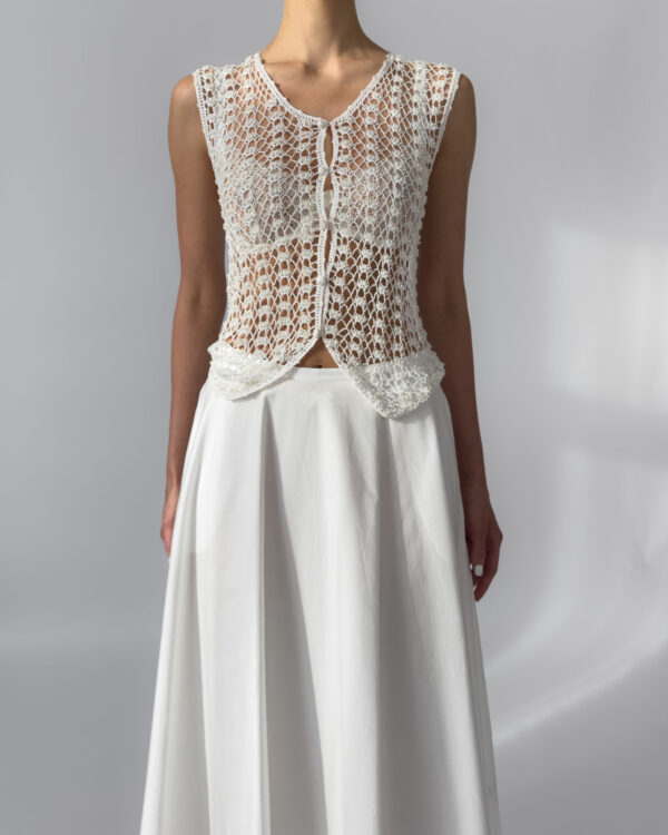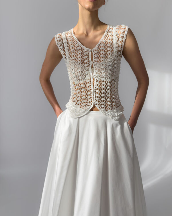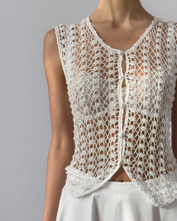 Delicate white vest with hand-embroidered crochet design, adorned with small white pearls. Features a button-up closure and a flattering fit. Perfect layered over dresses or styled with high-waisted trousers.