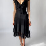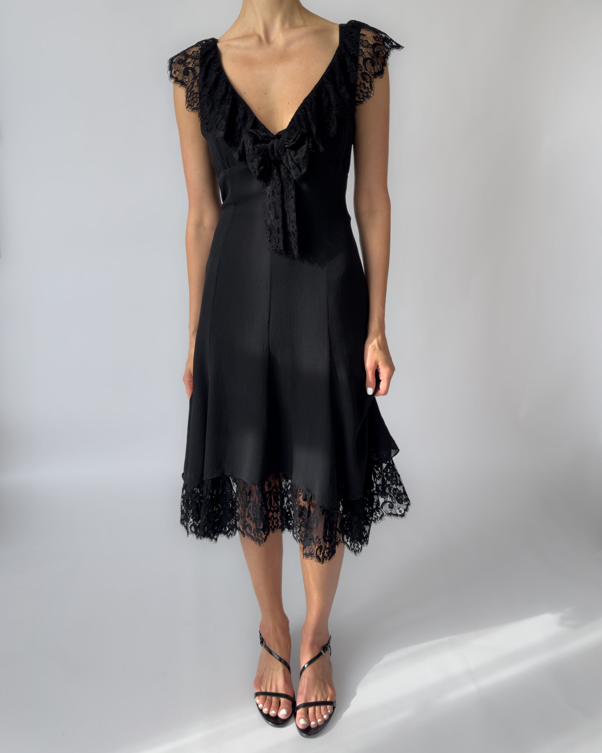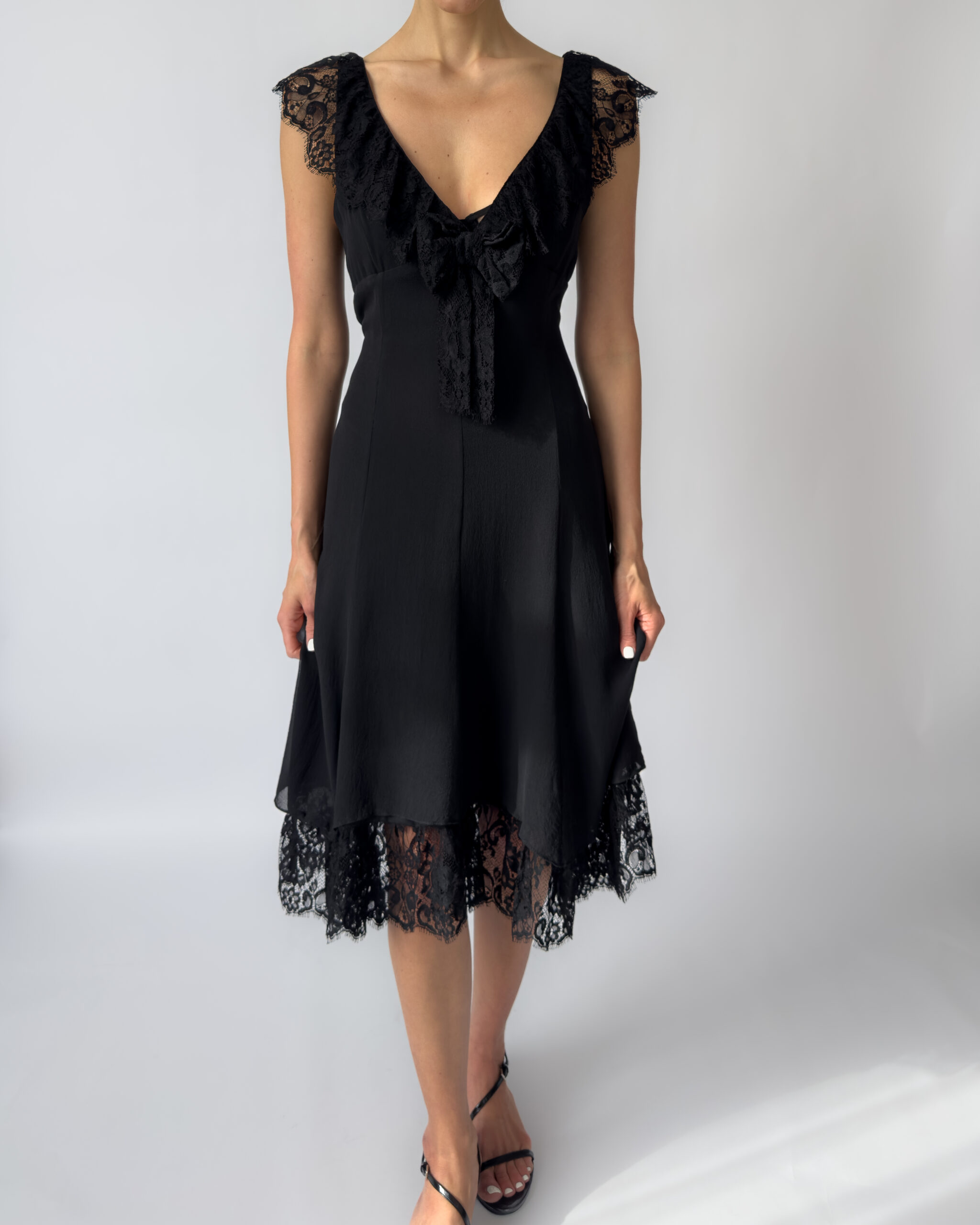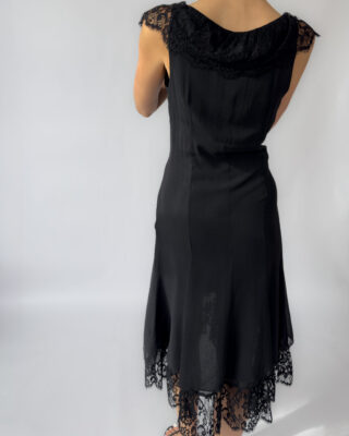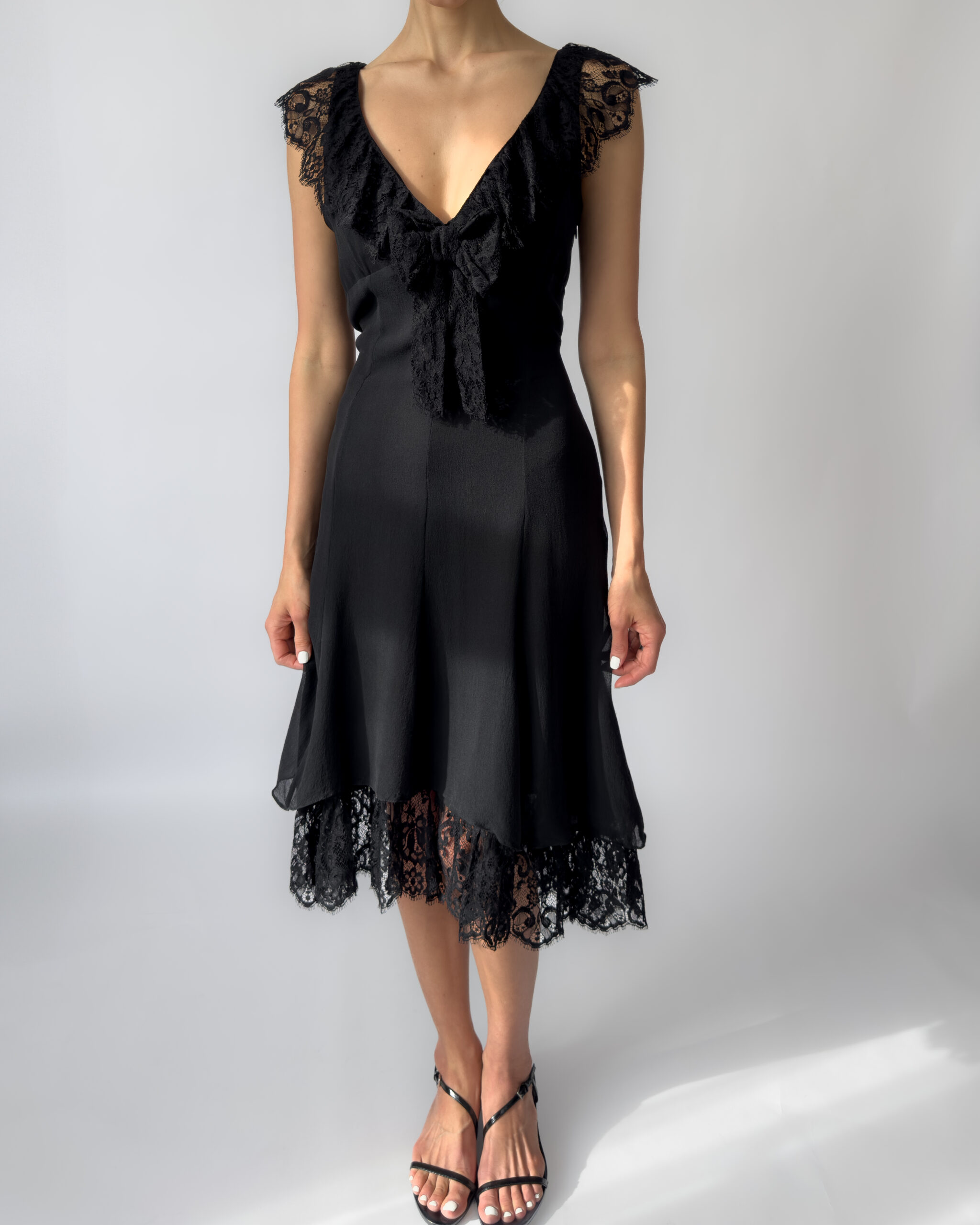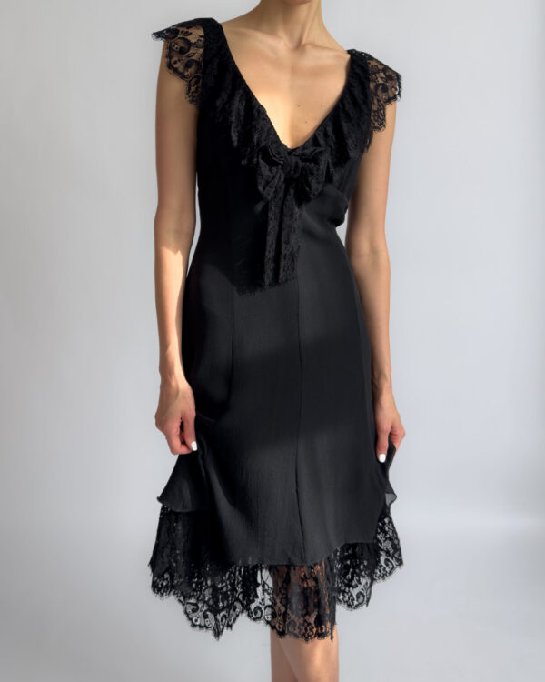 Karen Millen silk lace dress in black, featuring a deep V neckline, delicate lace cap sleeves, and a layered hem with scalloped lace detail. The dress has a flattering, fluid silhouette with a side zipper closure and two layers.