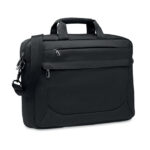 15 inch laptop bag in 600D RPET polyester. 2 main internal compartments for both laptop as tablet and large zippered front pocket. It has a small zippered pocket. Detachable and adjustable shoulder straps. Trolley holder on reverse side.