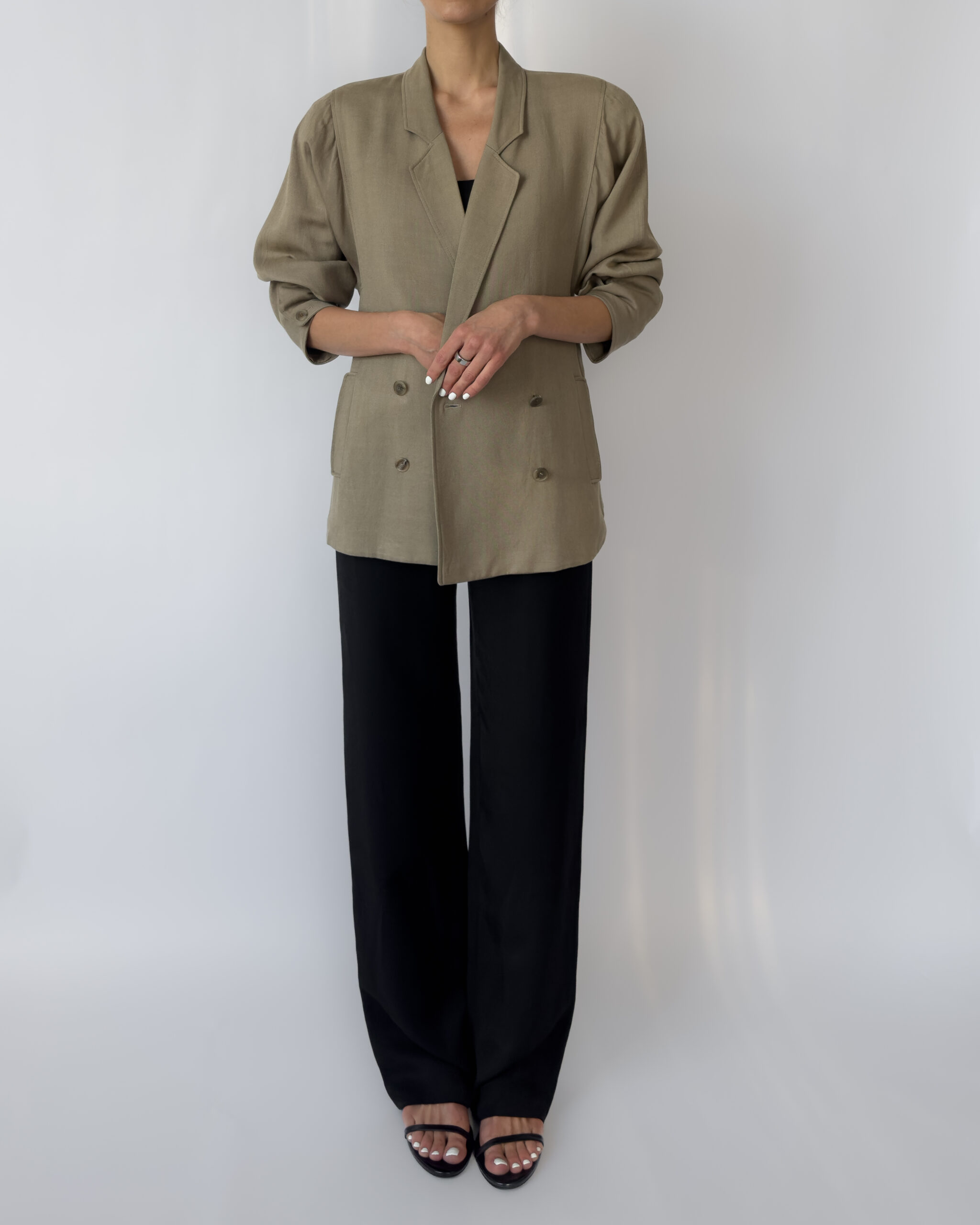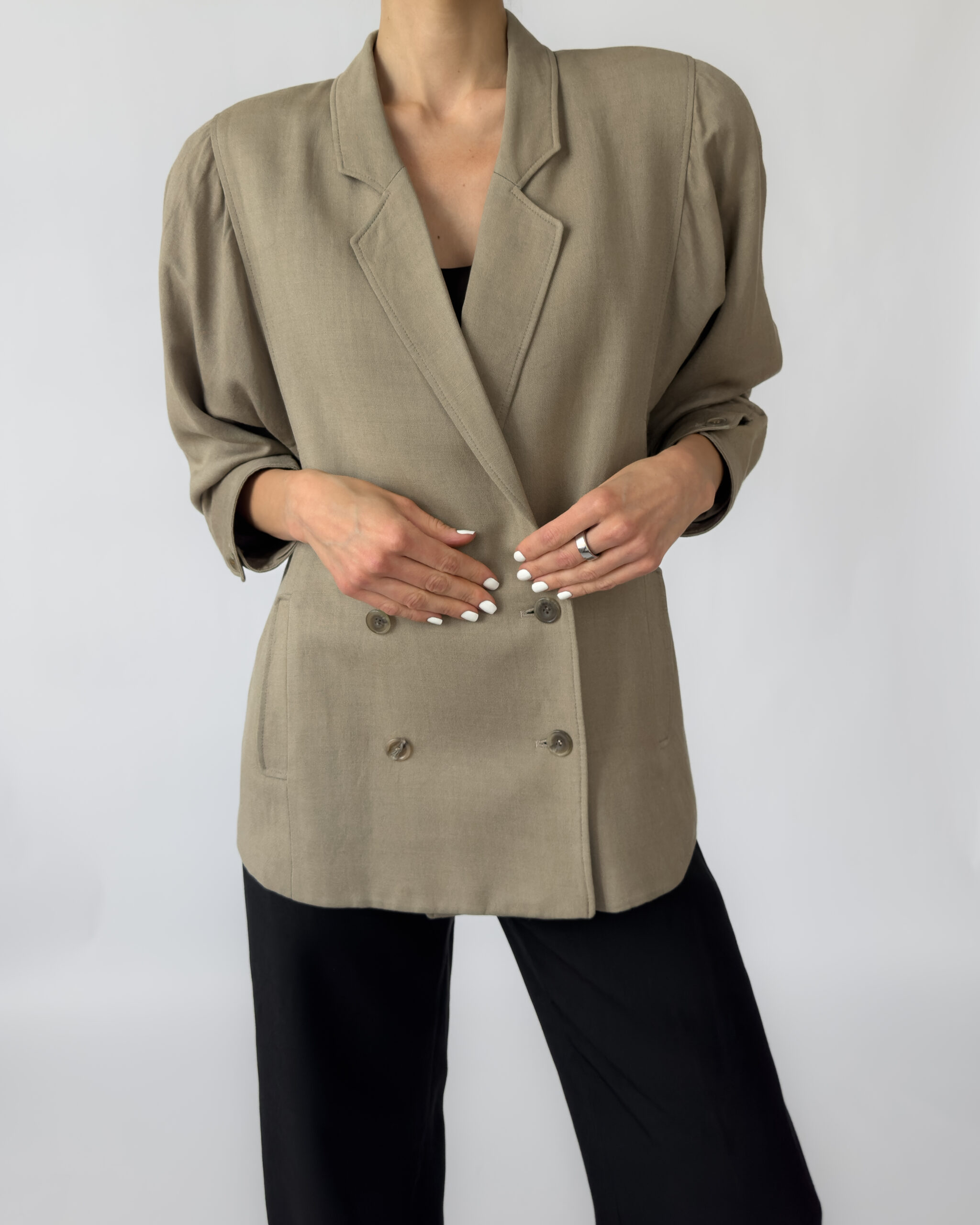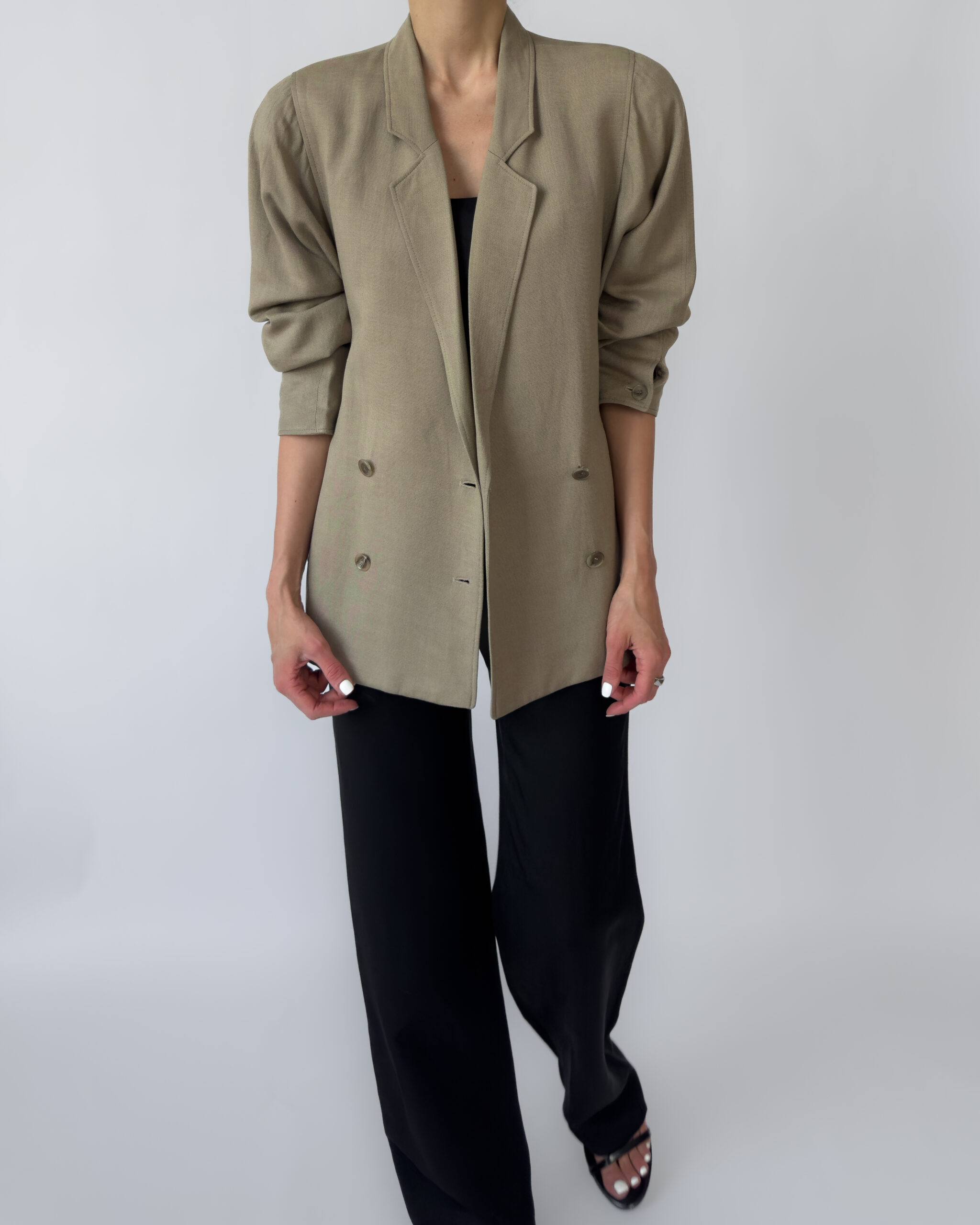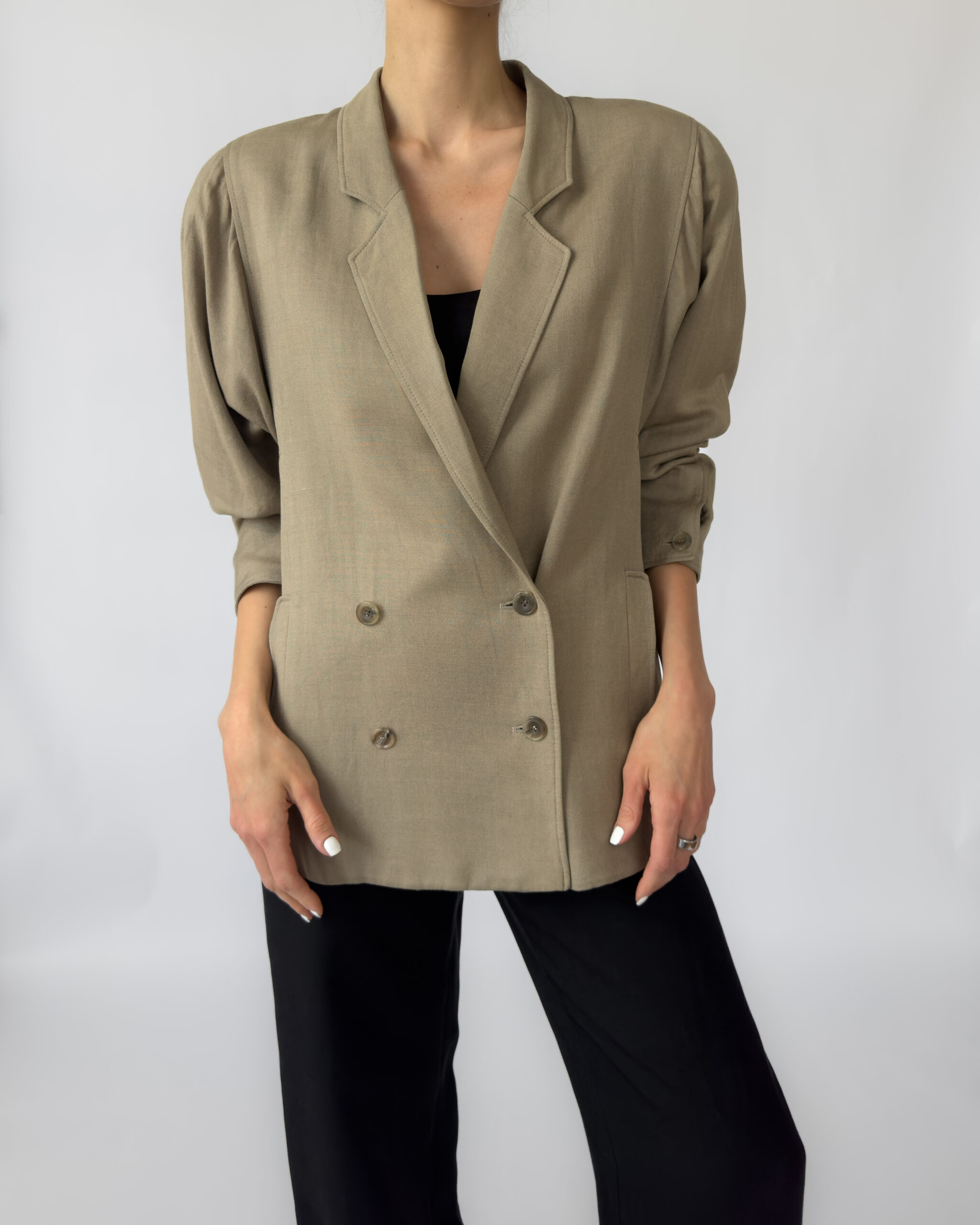 Double-breasted linen jacket in a muted olive green tone. Features a classic button-up closure, subtle shoulder pads, two front pockets, and a silky viscose lining for comfort. Elegant and versatile, perfect for layering in any season.