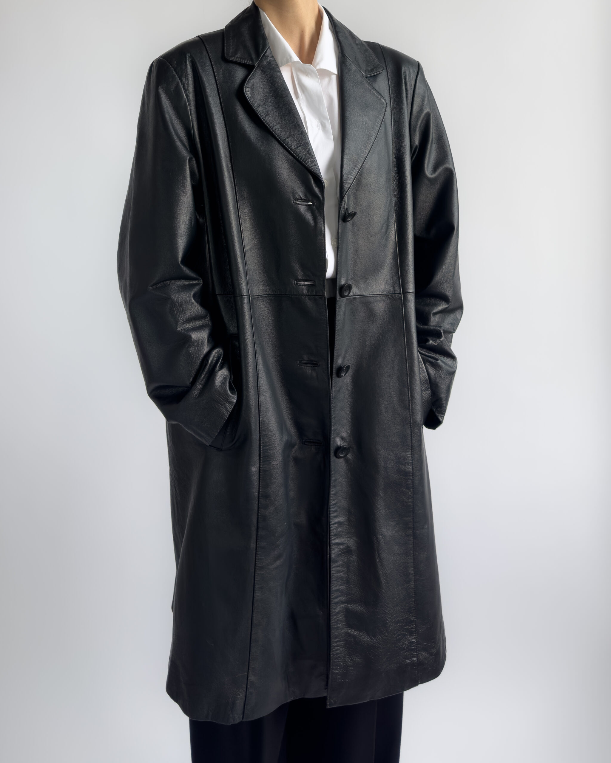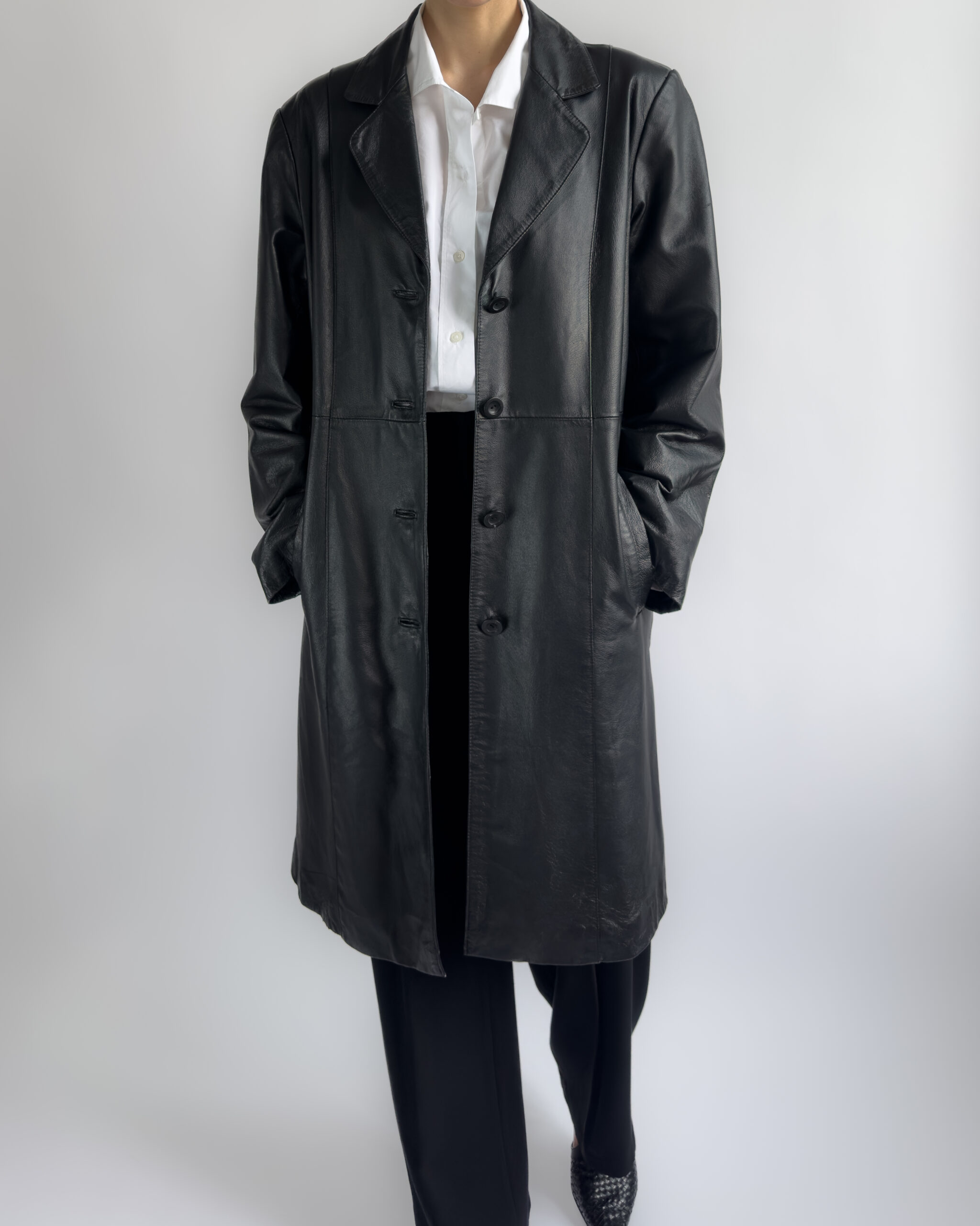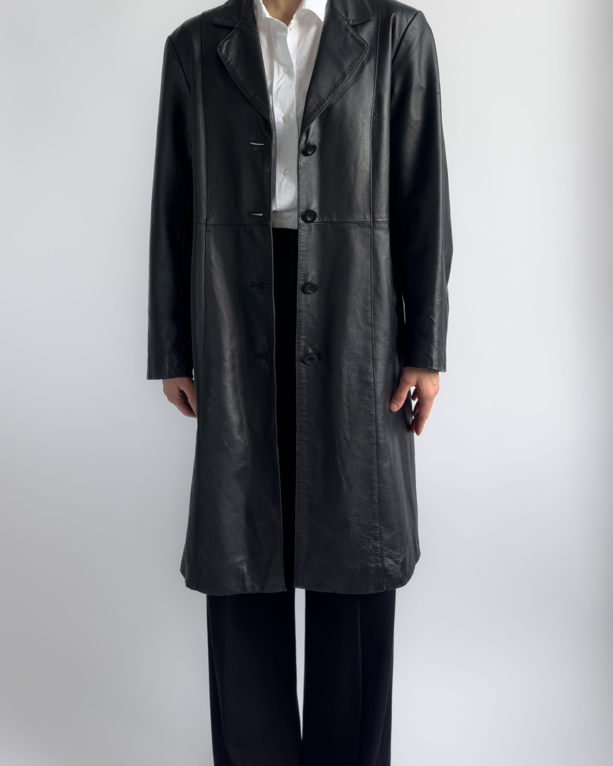 A sleek and timeless vintage coat made from smooth genuine leather in classic black. Designed with a tailored silhouette, sharp lapels and clean button front.