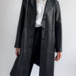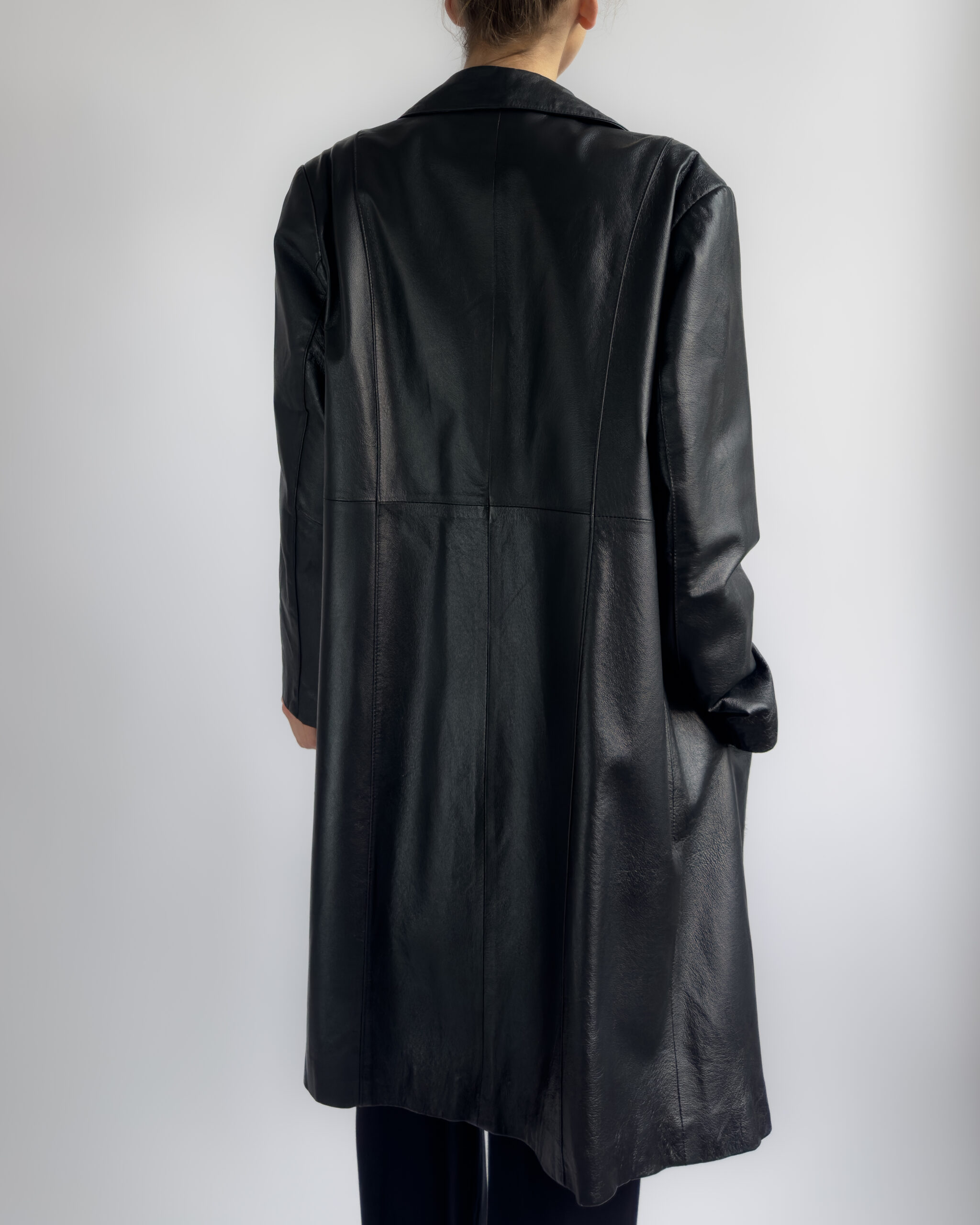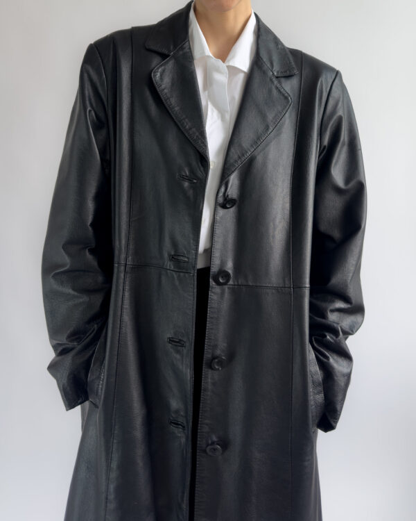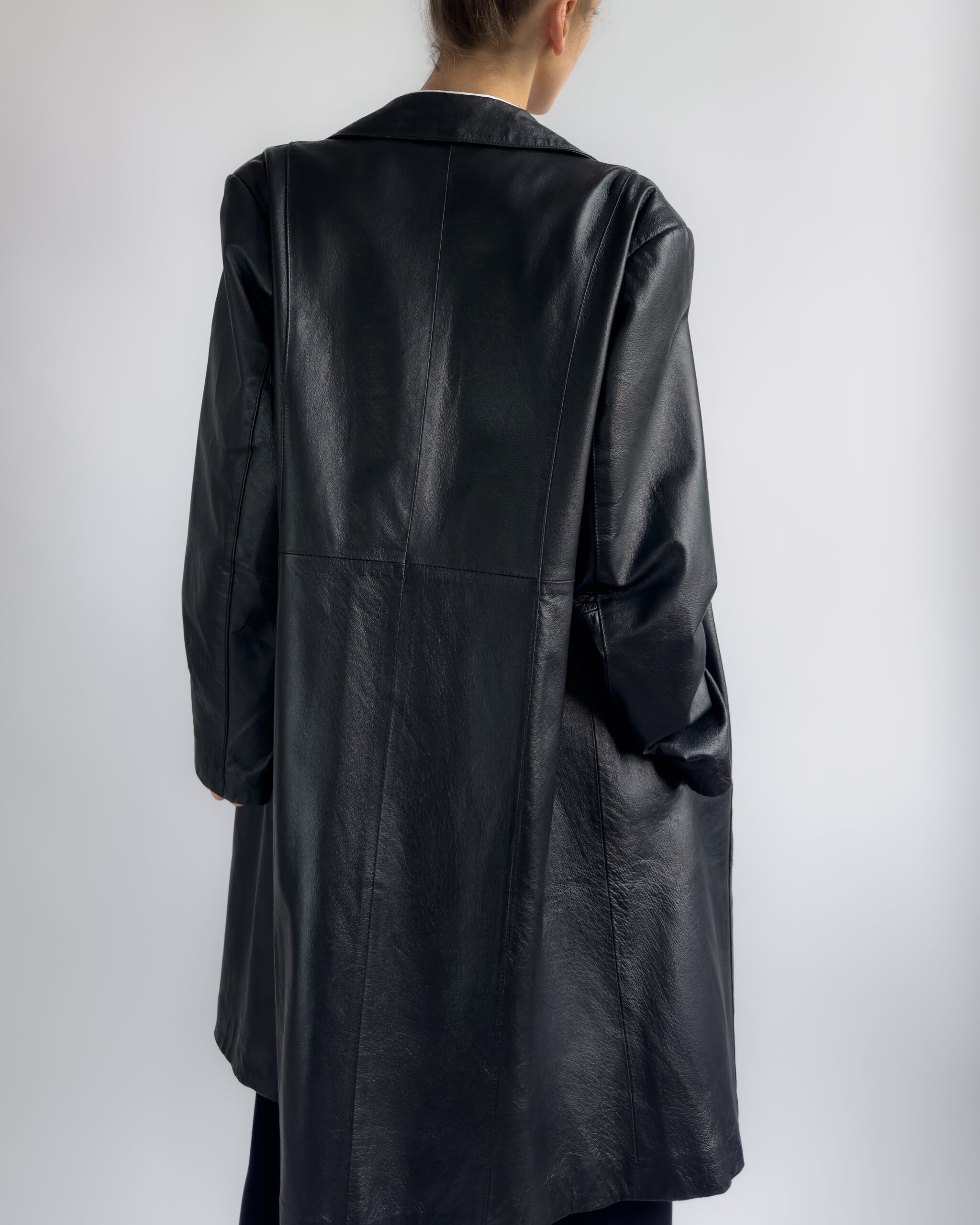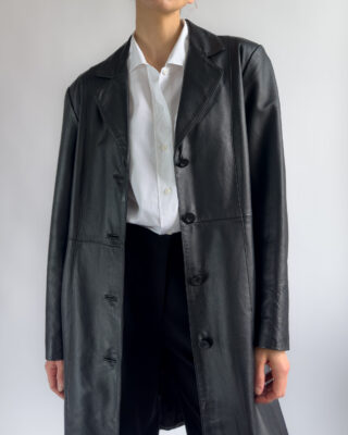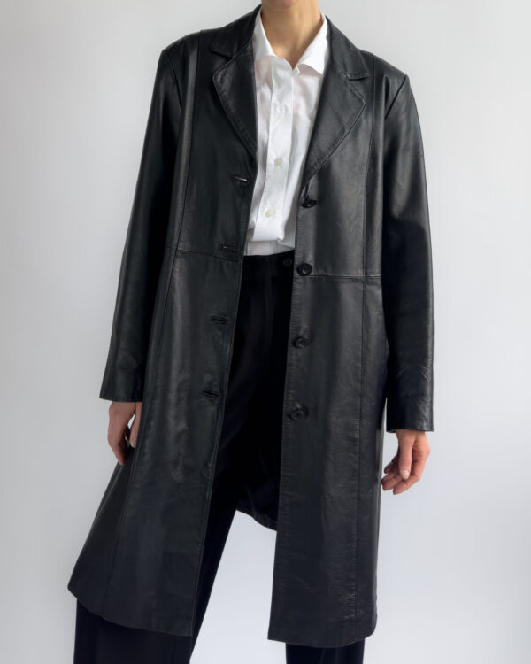 A sleek and timeless vintage coat made from smooth genuine leather in classic black. Designed with a tailored silhouette, sharp lapels and clean button front.
