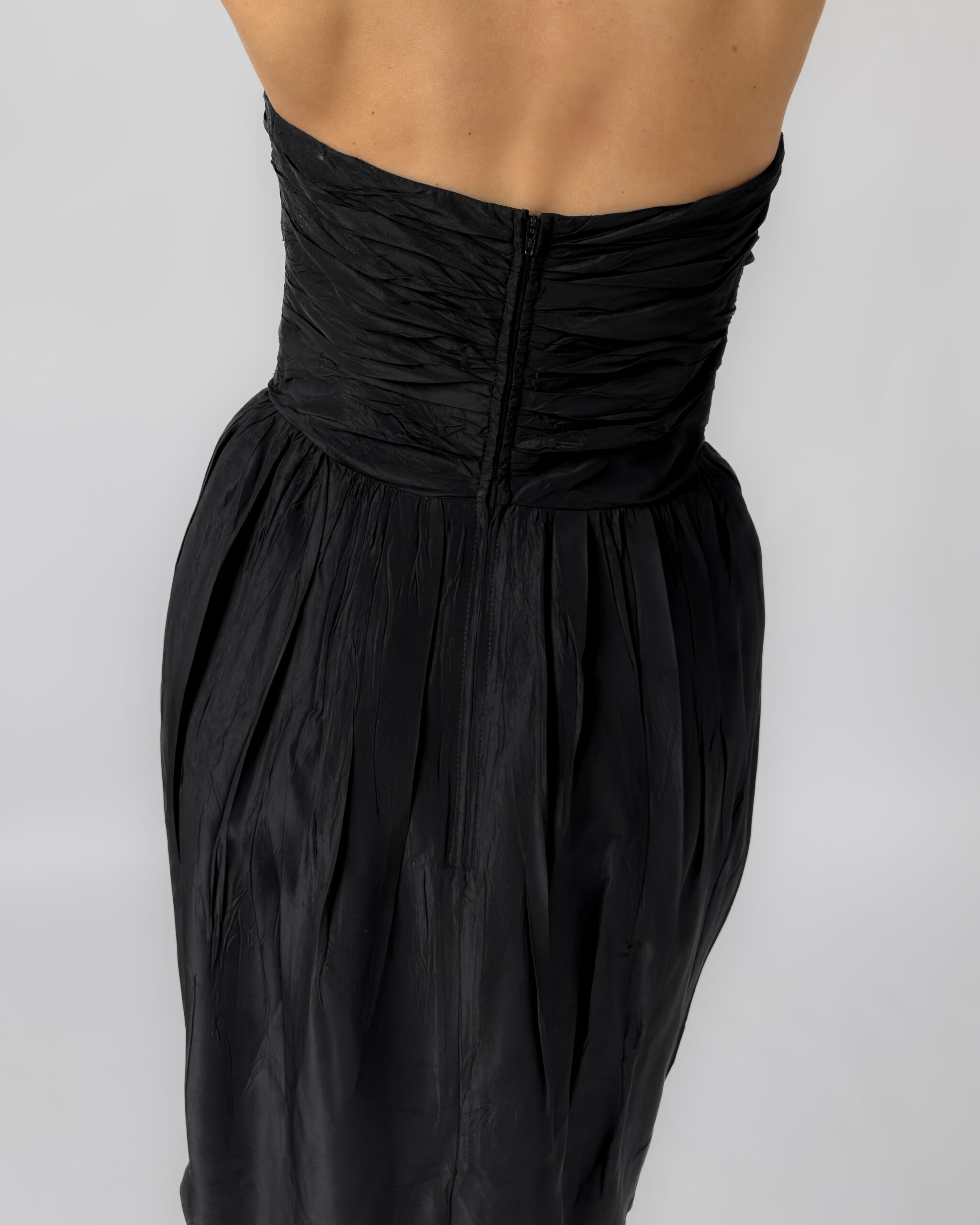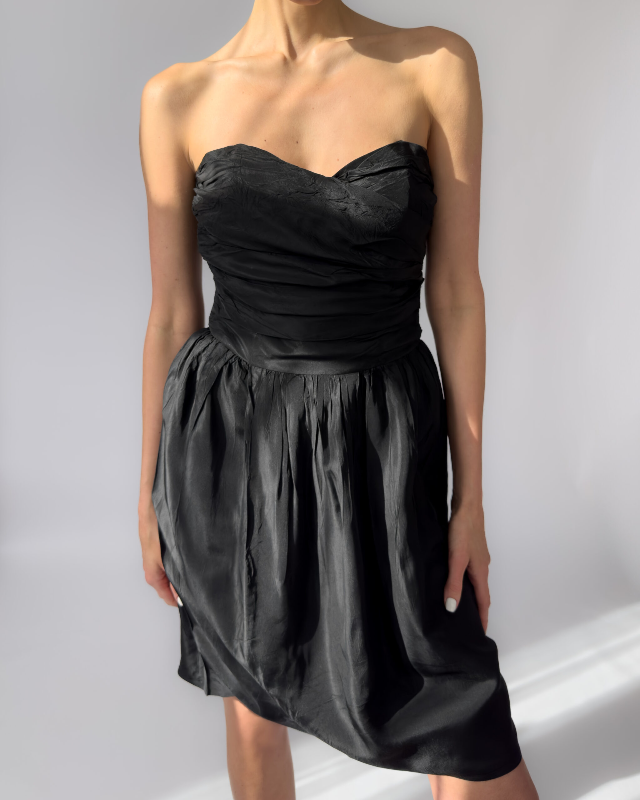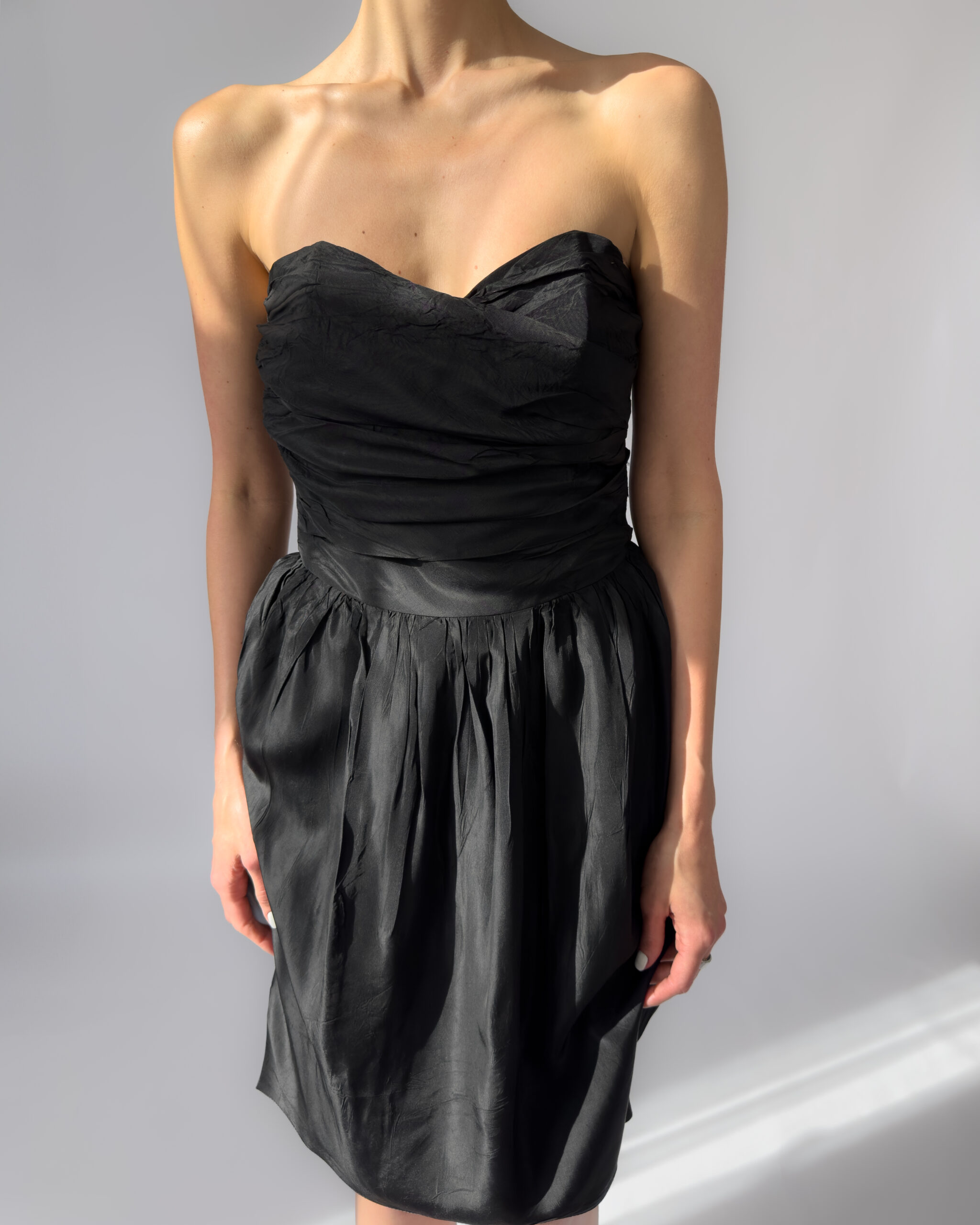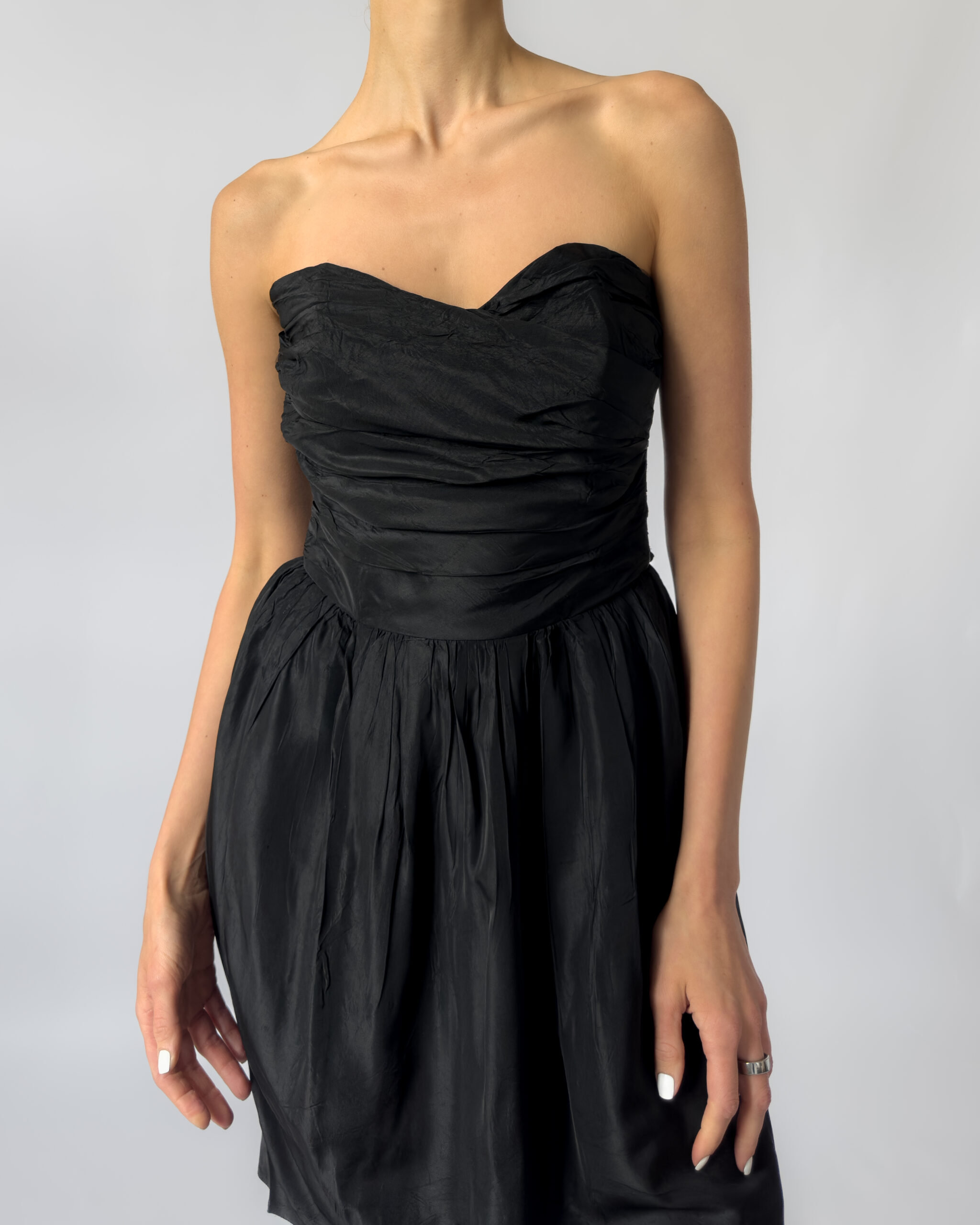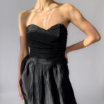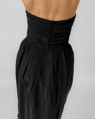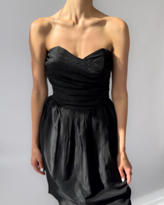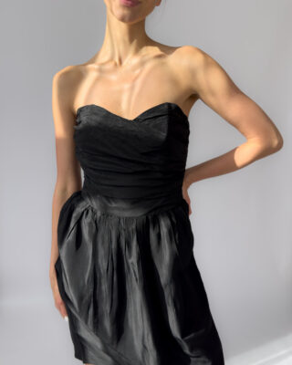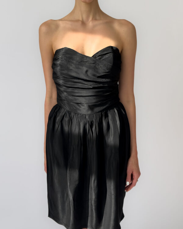 Elegant Marc Aurel corset dress in black. Features a strapless sweetheart neckline, ruched corset bodice, and a softly gathered skirt. Made from 100% acetate with a subtle sheen. Labelled as size 40.