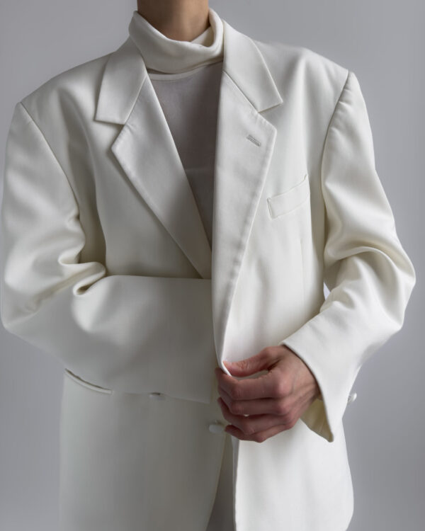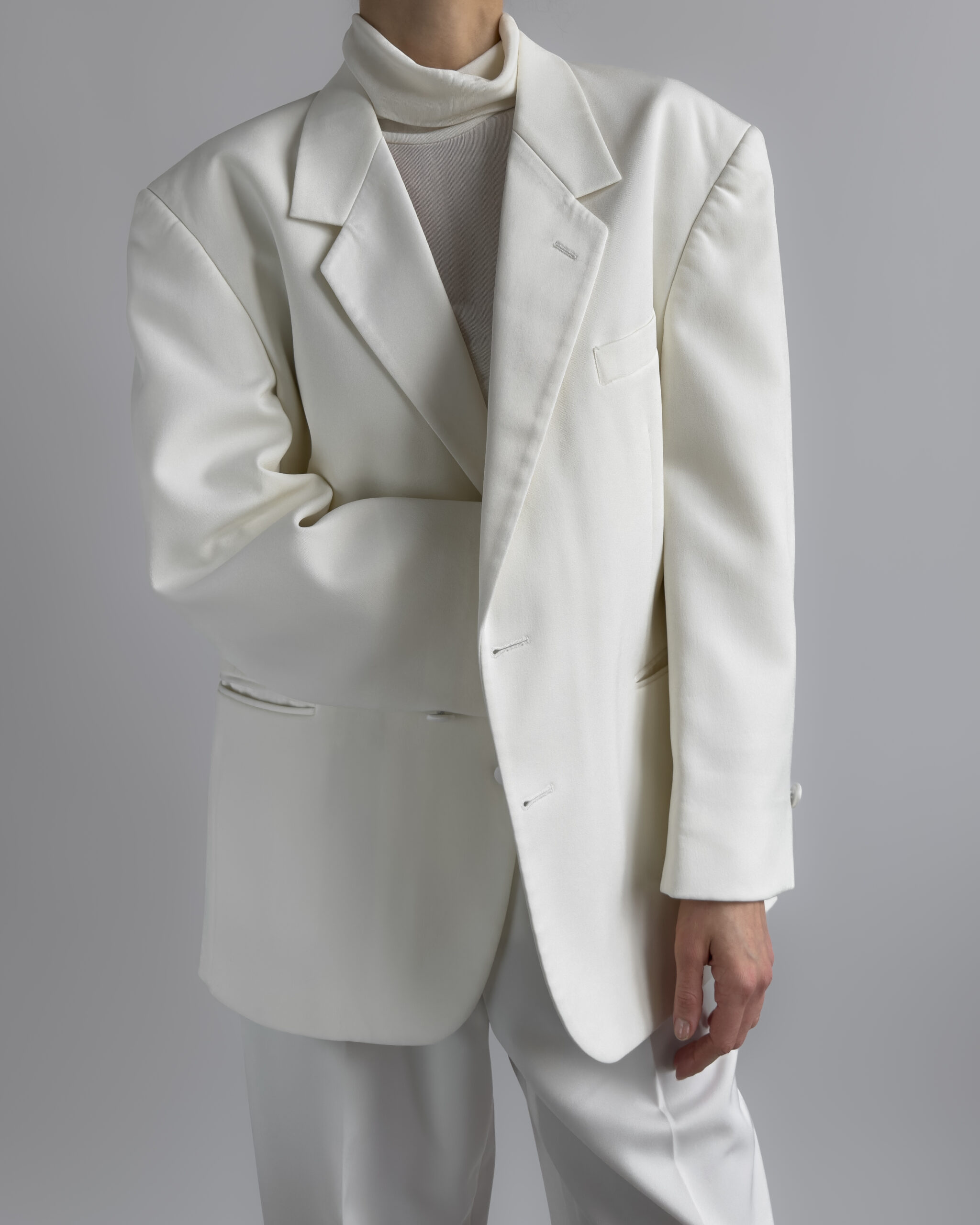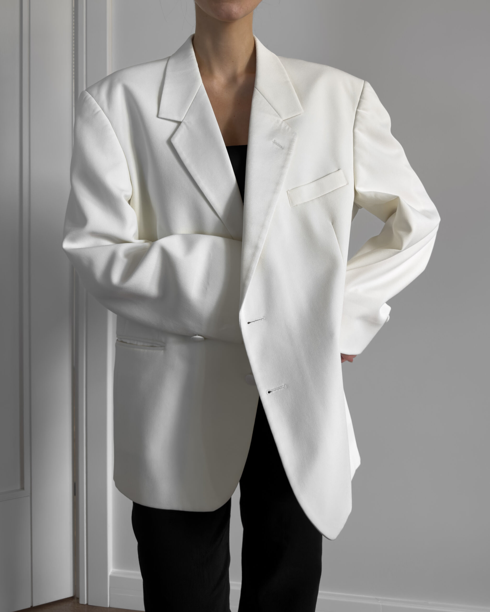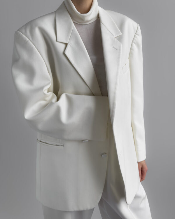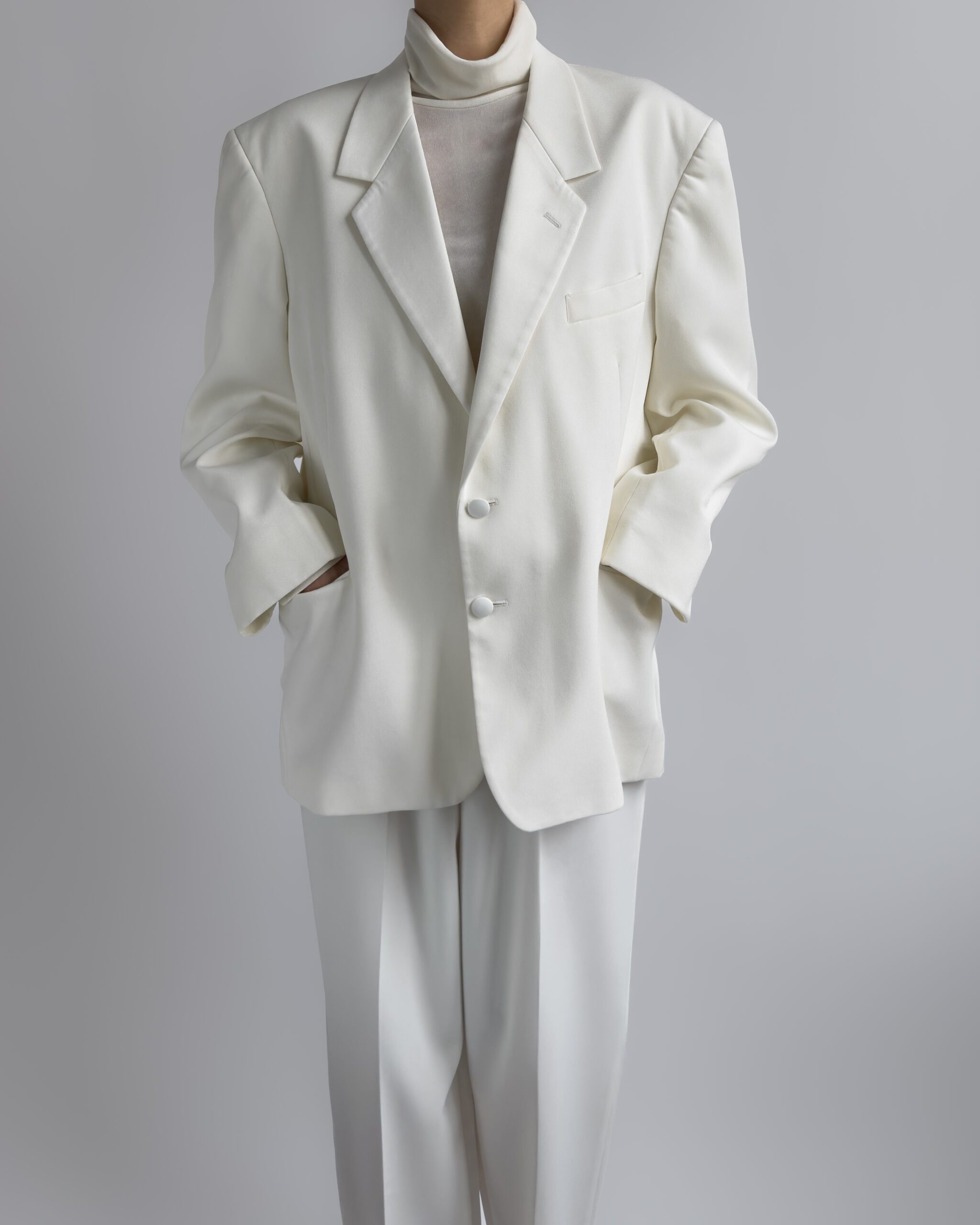 A refined blazer in crisp cream white. Features an oversized cut with structured shoulders and subtle satin-trim details at the lapel and buttons. A standout piece for modern tailoring.