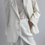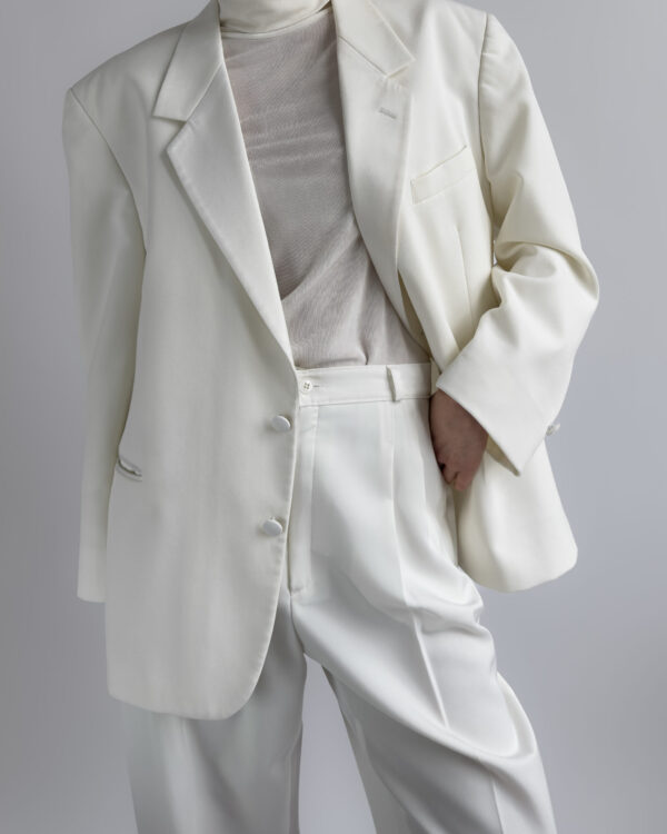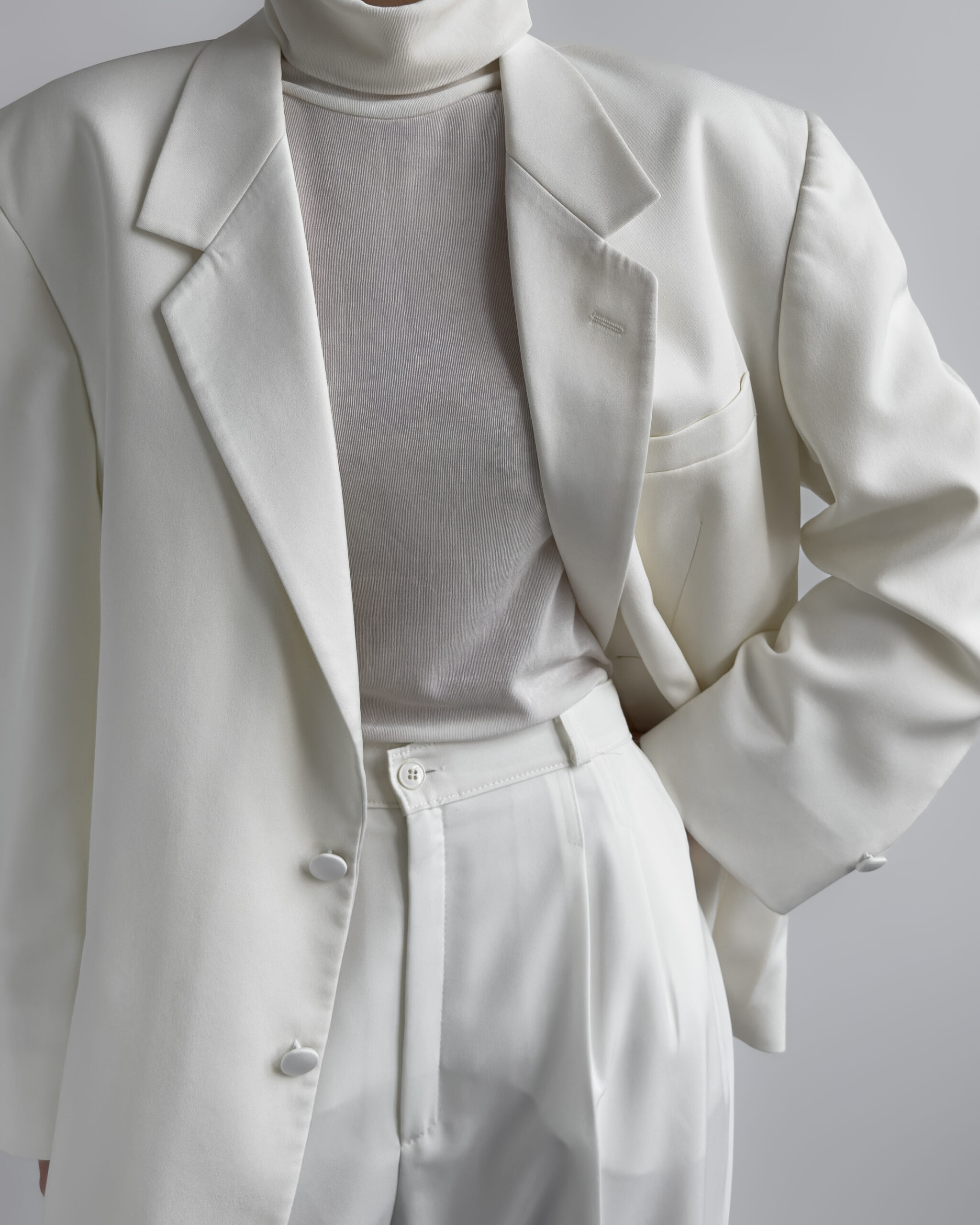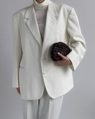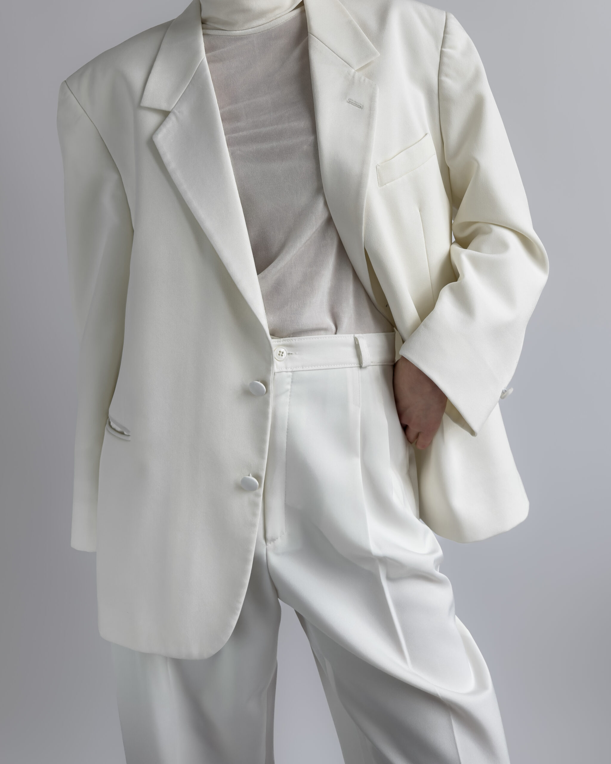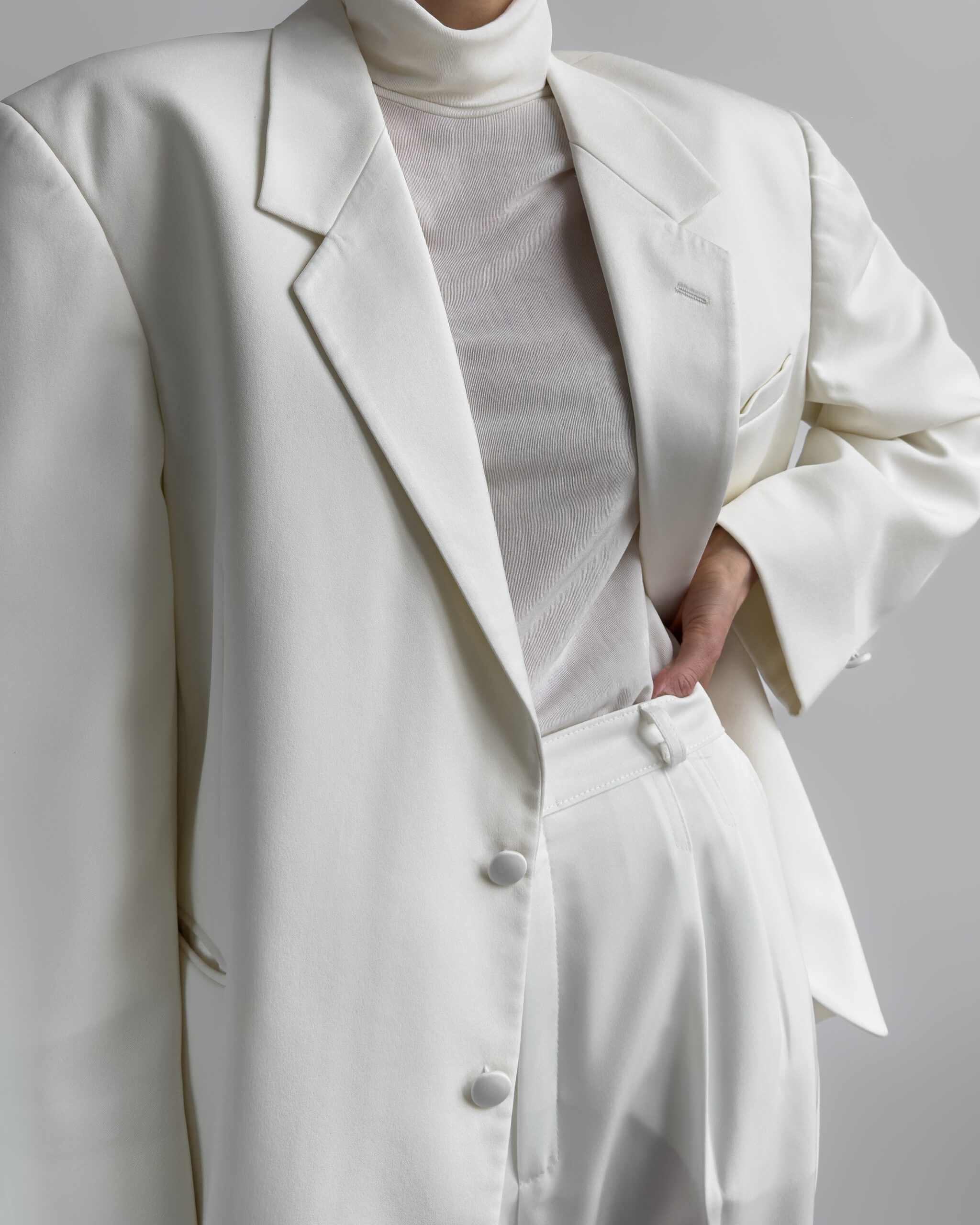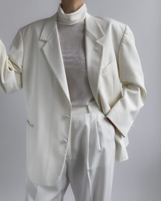 A refined blazer in crisp cream white. Features an oversized cut with structured shoulders and subtle satin-trim details at the lapel and buttons. A standout piece for modern tailoring.
