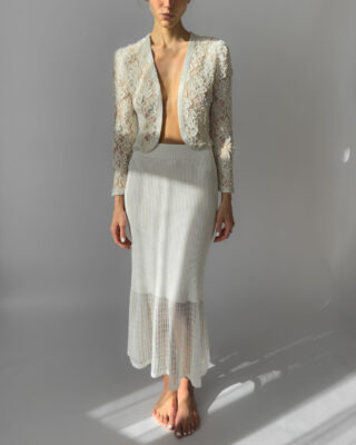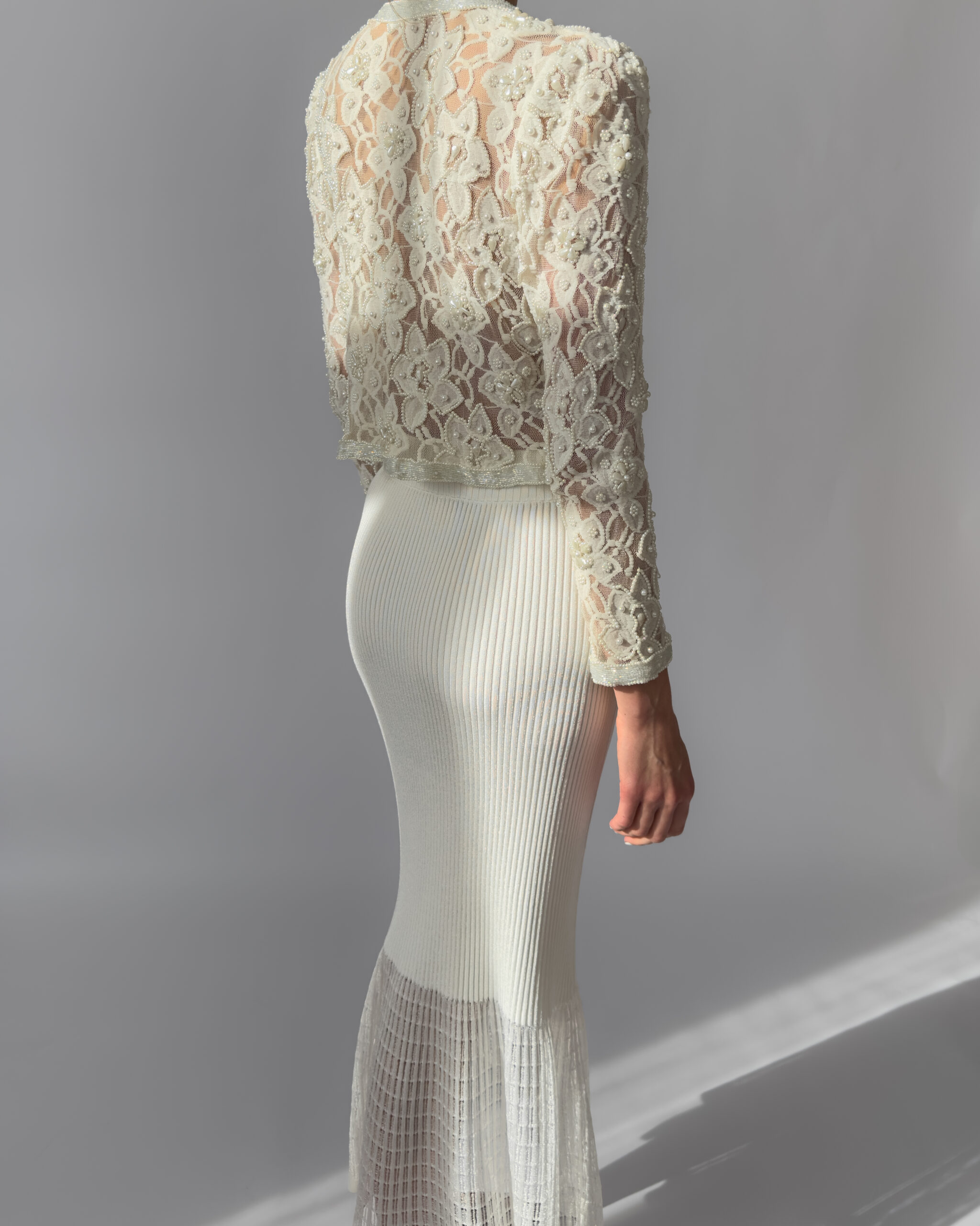 Exquisite cream lace jacket fully embroidered with pearls, featuring delicate floral motifs and a slightly cropped silhouette. This high-quality, possibly handmade piece is perfect for weddings, evening events, or as a unique statement layer. In perfect vintage condition.