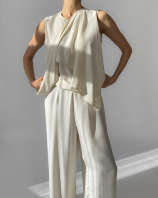 Elegant 100% silk blouse in a soft cream white shade. Features a draped scarf detail that allows for multiple styling options—tie, drape, or twist for a modern, chic look. Lightweight and fluid.